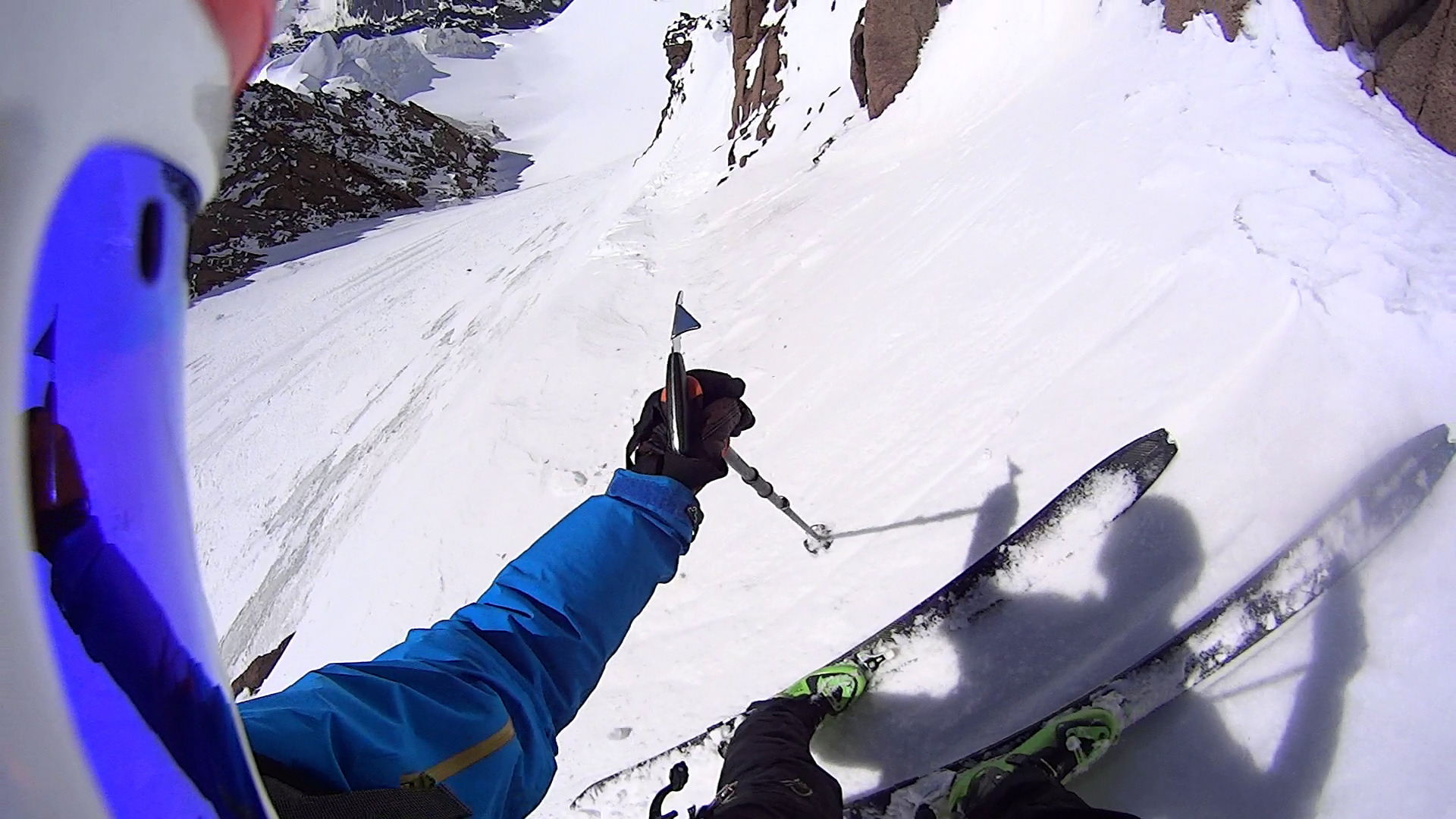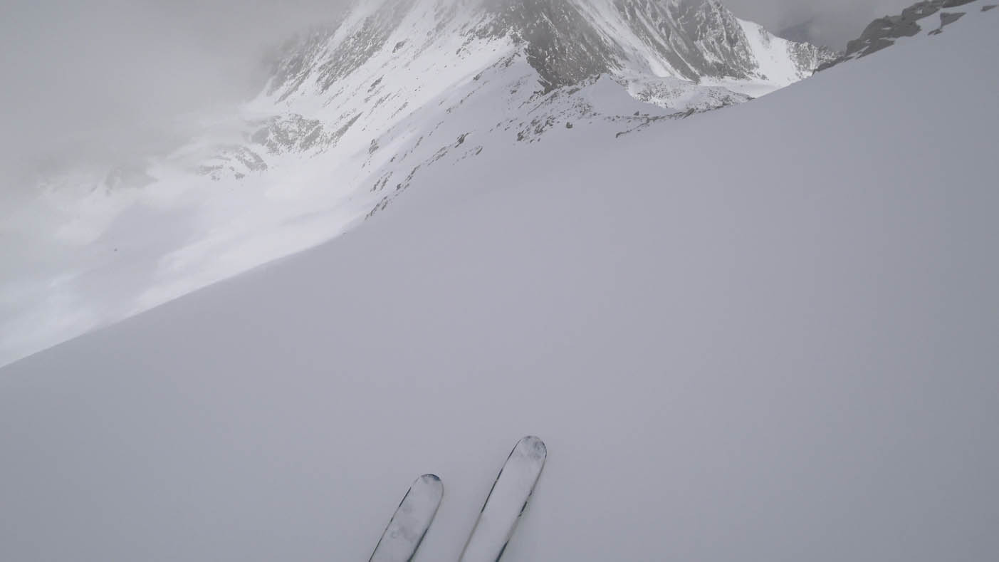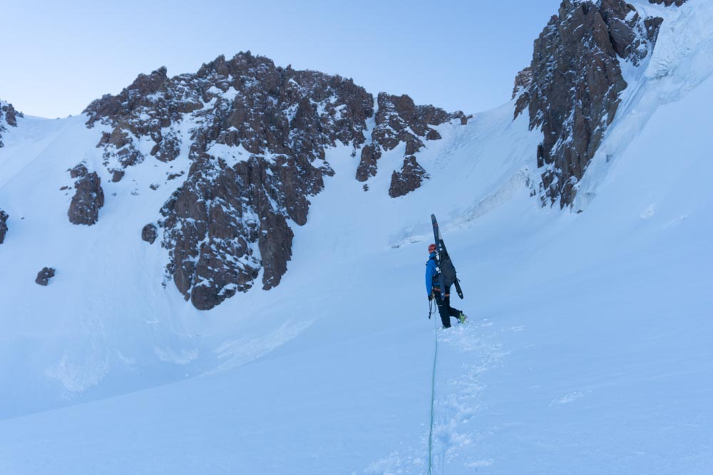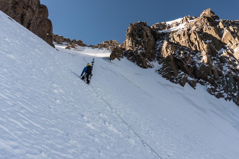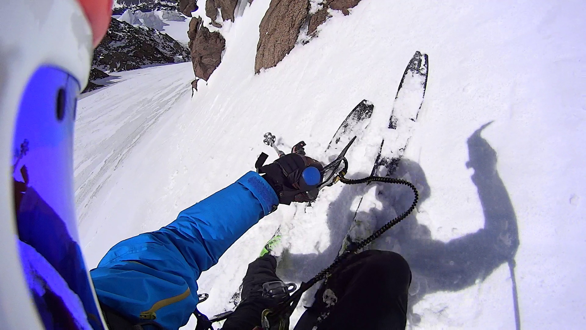 На одном участке было так узко, что повернуть было практически нереально, и приходилось зарубаться ледорубом спускаясь лесенкой. Благо таких отрезков было всего ничего, и мы благополучно попали в кулуар выше бергшрунда, протяженность которого и состояние снега вселили больше уверенности, и получилось ехать более связными поворотами. С каждым виражом вниз склон становился более фановым, и ноги приноровившись уже подстроились под рельеф.