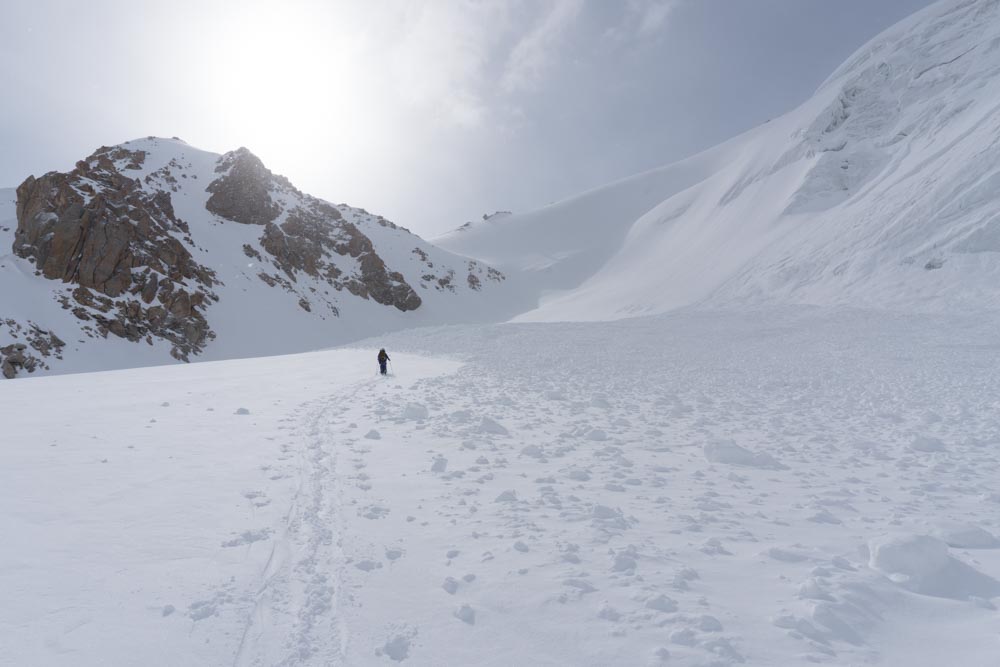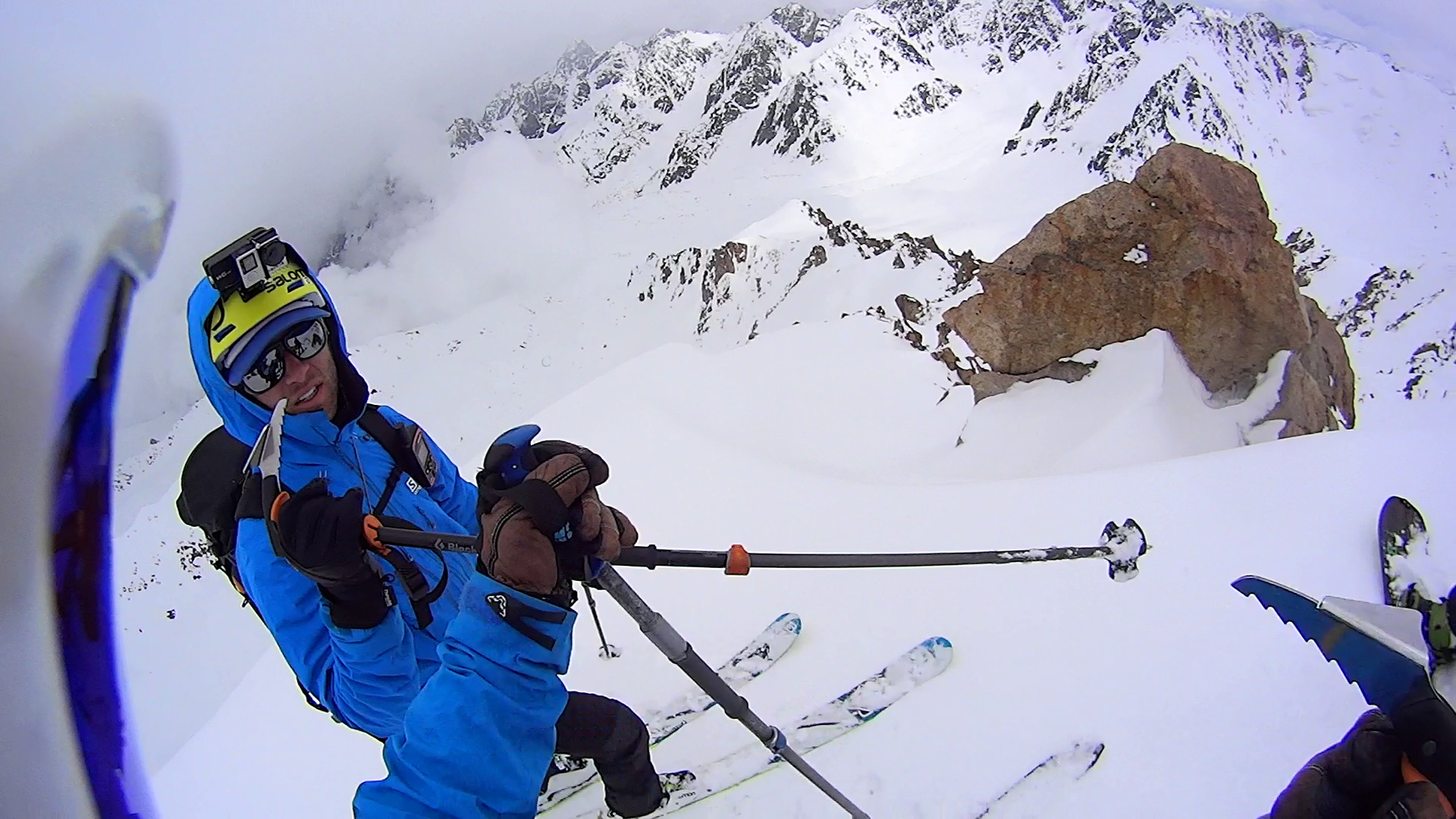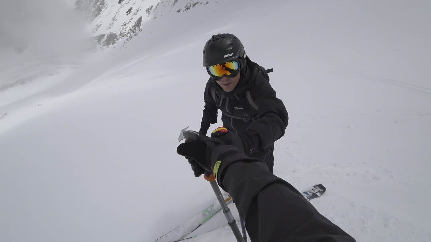 Утром мы выдвинулись в сторону ледника Туюк-су и дальше через одноименный перевал вылезли на «Плечо Туюк-су», 4150м. Вылезли очень слаженно и четко, все спортсмены, прорайдеры и не возникало никаких сомнений, что мы будем ходить быстрее, чем обычно. Кругом следы коммерческих групп Сноу-Сенс и других ребят. Где ехать? Решили двигаться правее от пика в сторону главной вершины и ехать прямо по центру оледенения, намного правее классики. Когда-то давно – то ли в 2005 то ли в 2006 лысом году ее ездили BC team – Маста, Олег Королев и Дав. Немного затянуло и мы, дождавшись «окна» дропнули вниз, по очереди. Не помню кто первый, да это и не важно. Был небольшой ориентир – чужие следы, но места было валом и удалось чисто и фаново проехать через сераки и трещины и дальше вниз на пологий ледник. Из-за облачности Анины съемки c дрона не получились, да и спуск, я бы не сказал, что сильно впечатлил. Обычный рабочий склон, но без перчинки, без изюминки. Благополучно спустились на базу. Chill out.