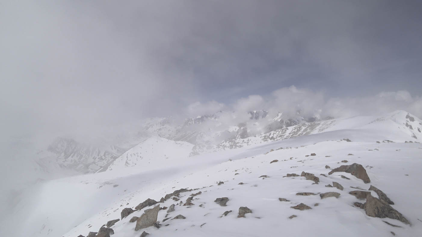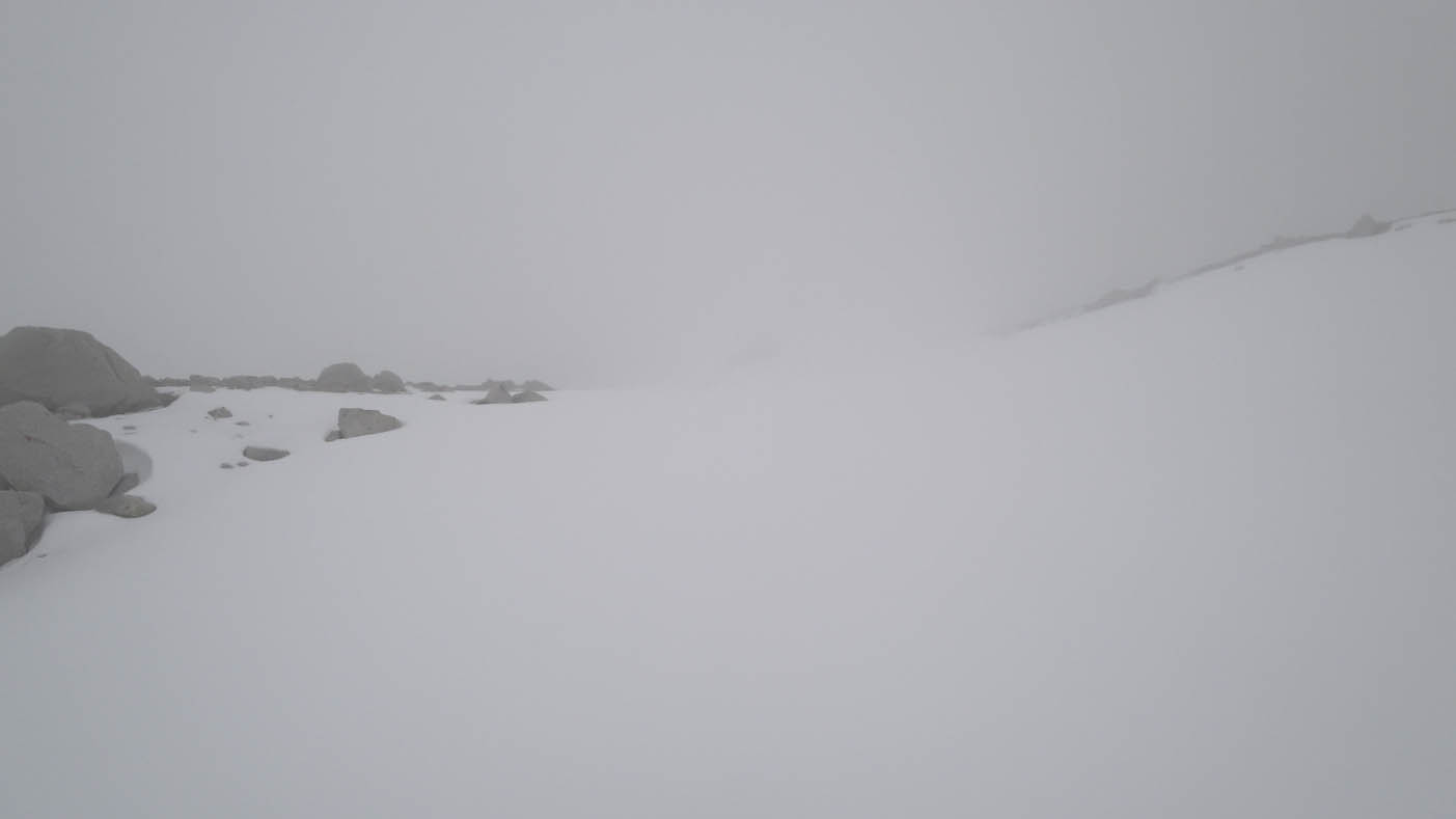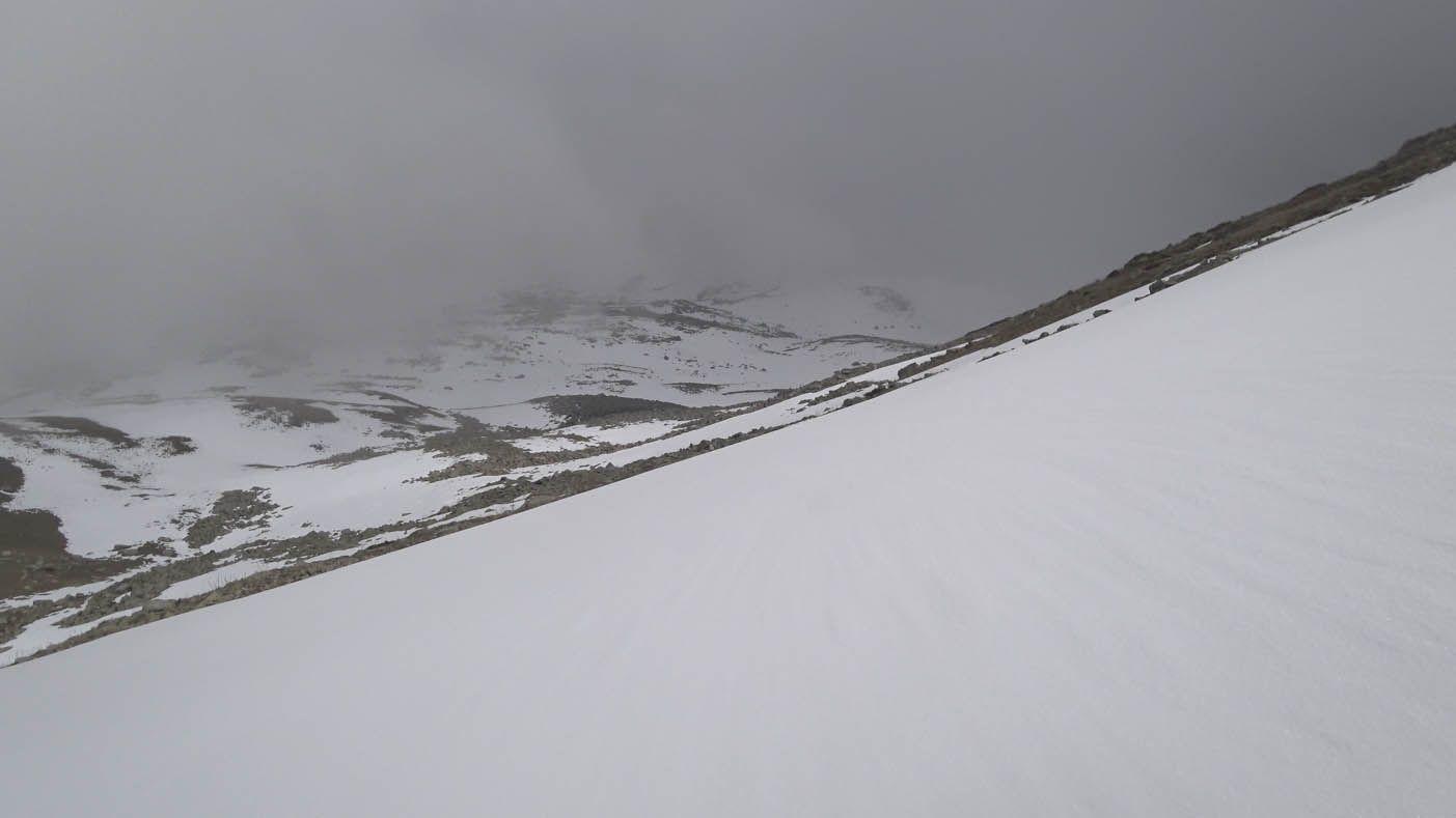 Засада заключалась в том, что все наши спуски все-таки затянуло и пришлось проторчать больше часа на вершине. Окно так и не открылось и мы начали наш спуск по классике вдоль гребня справа, почти что по пути подъема. Более сложный спуск вдоль «серпа» в «чаше» и далее в кулуары был невозможен. К сожалению, первые 100 м ехалось на ощущениях в «молоке» и была хорошая проверка вестибулярного аппарата, но потом нам повезло и мы проехали оставшиеся 400 м по леднику Карнизному при нормальной видимости.