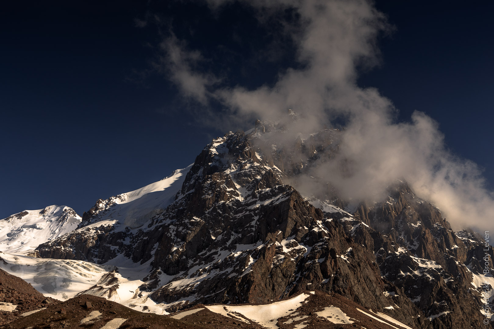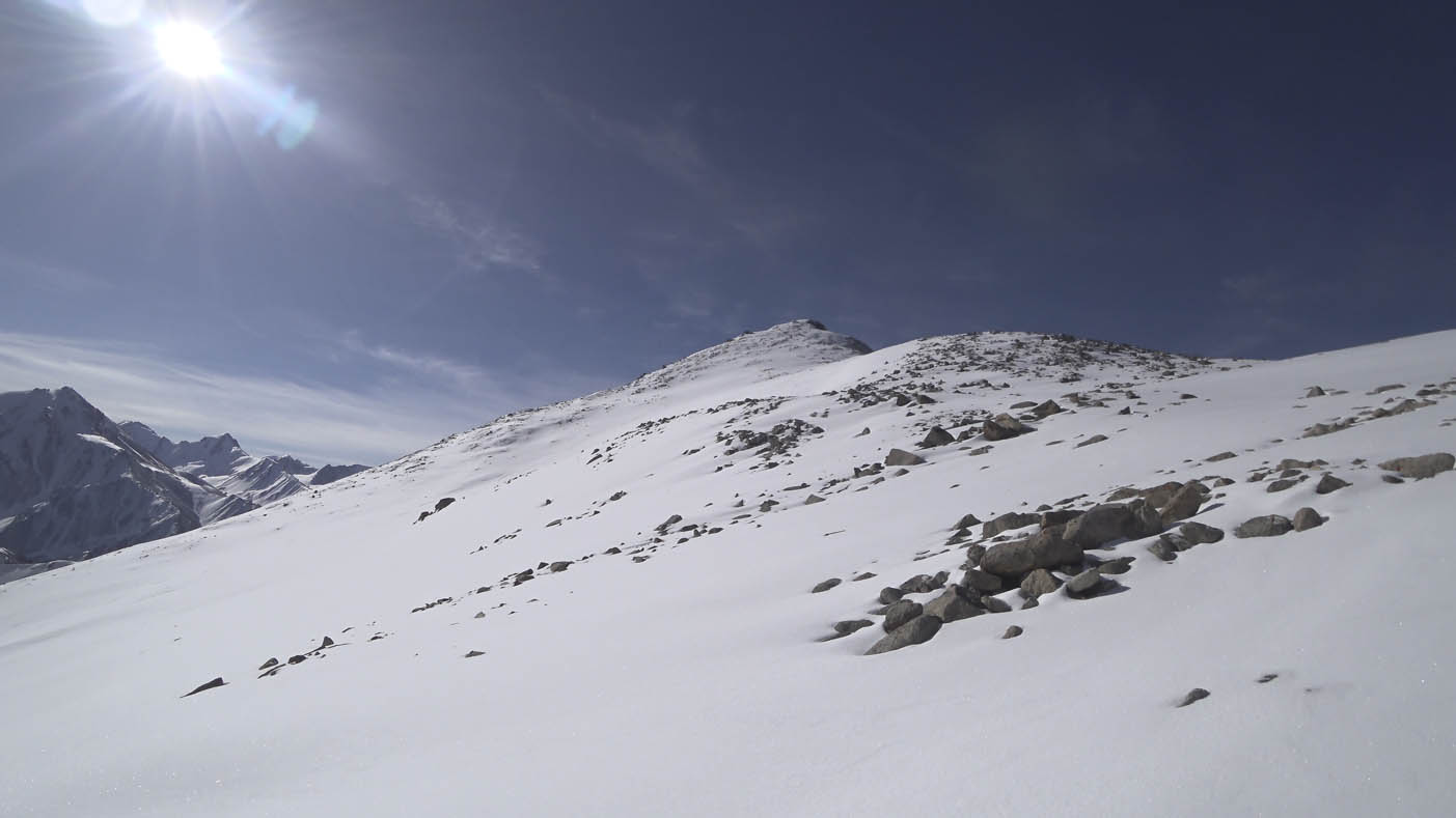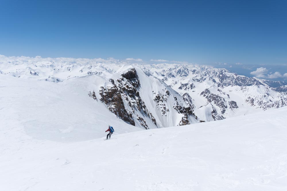 Хорошая погода, ранний выход. Все как обычно. Поскитурили от базы на Молодежный, 4128м. Так и залезли, не снимая лыж! Спасибо предыдущей группе за тропу. Ошибочно называть весь процесс «скитуром», как это сейчас бывает модно. Видимо тренд начали далекие от катания и восхождений люди. Мы занимаемся фрирайдом в больших горах, а как там вначале – идешь ли ты на лыжах, лезешь ли в кошках, в скальниках, с простой доской или со сплитбордом поднимаешься вверх – не имеет значения. «Ау, сноубордисты, вы тоже скитуром занимаетесь?» Главное, ребятки – это спуск!