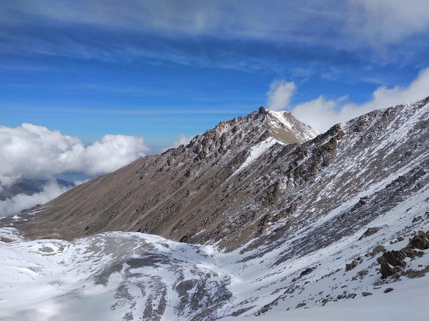 На перевал между пиками забежали достаточно бодро, но проблема вылезла откуда ее не ждали. Снег был на редкость не скользкий и «глайд» при ходьбе на лыжах был так-себе. Тупило. Я уж хотел использовать дорогой крем в качестве смазки, но решил перетерпеть.