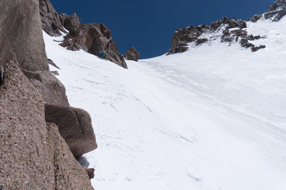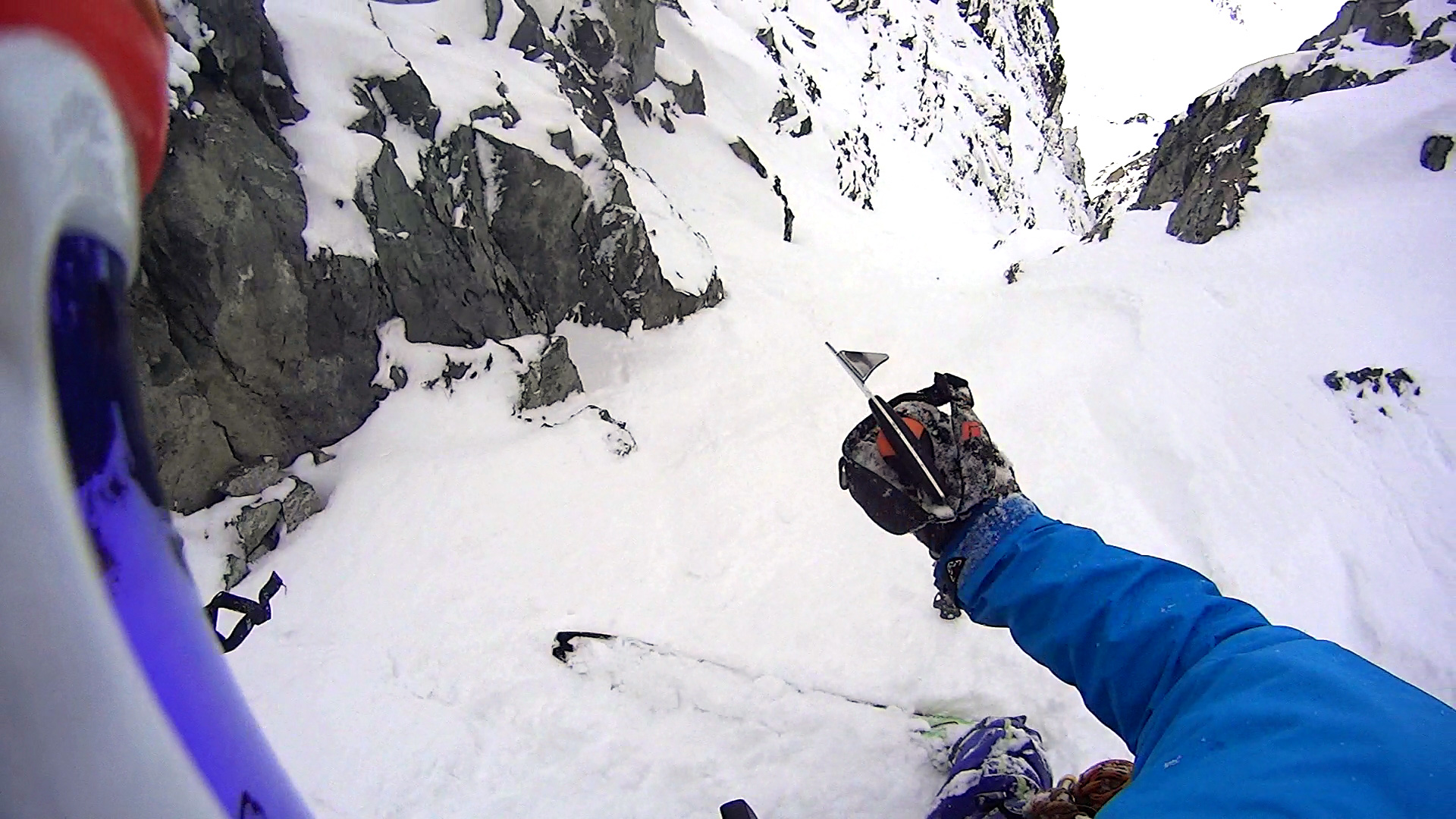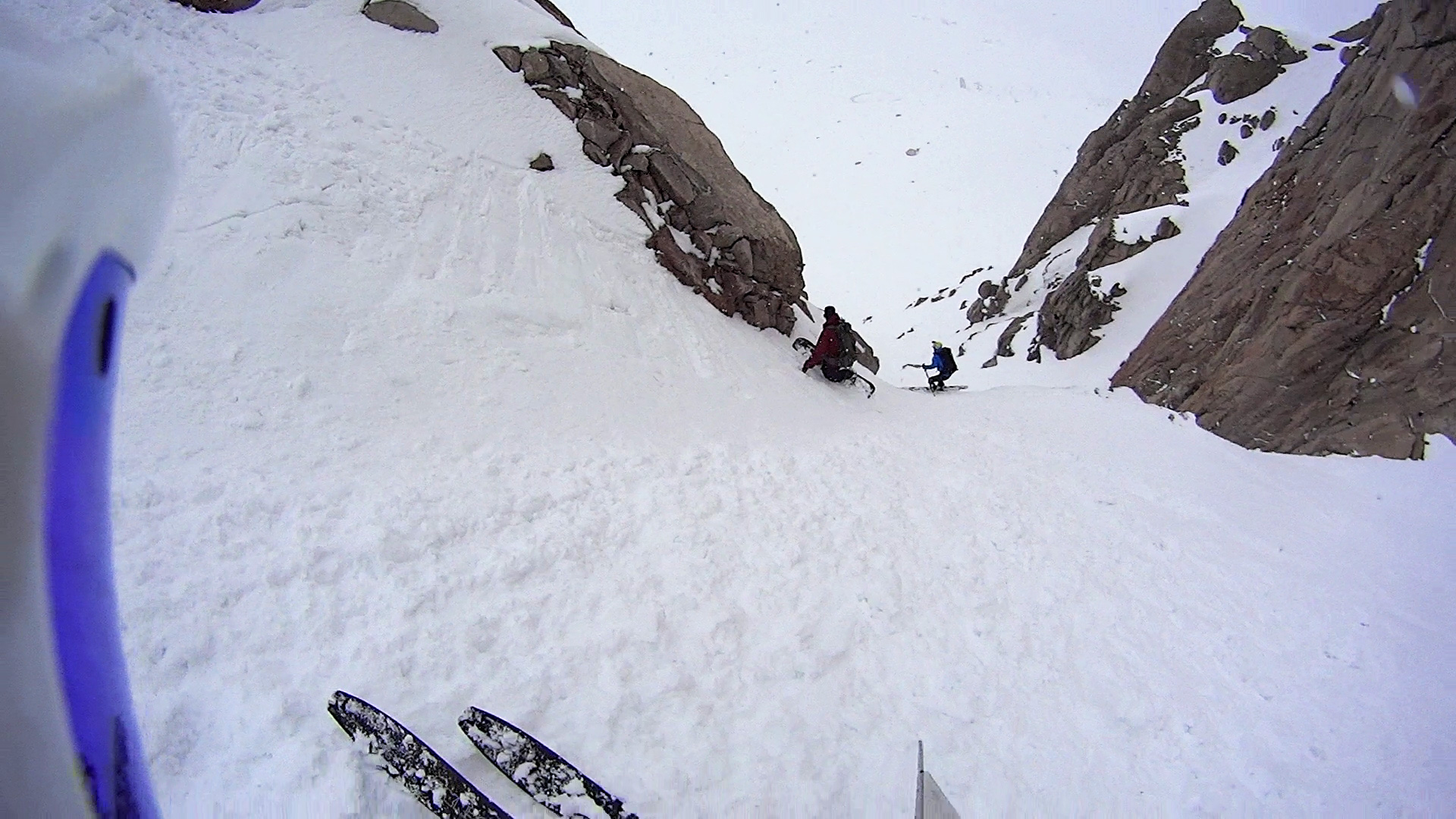 На мой взгляд состояние снега было хорошее, несмотря на следы старой лавины уже в сужении малого кулуара. Верхние поля шикарные, но поймать пару камней все-таки не повезло.