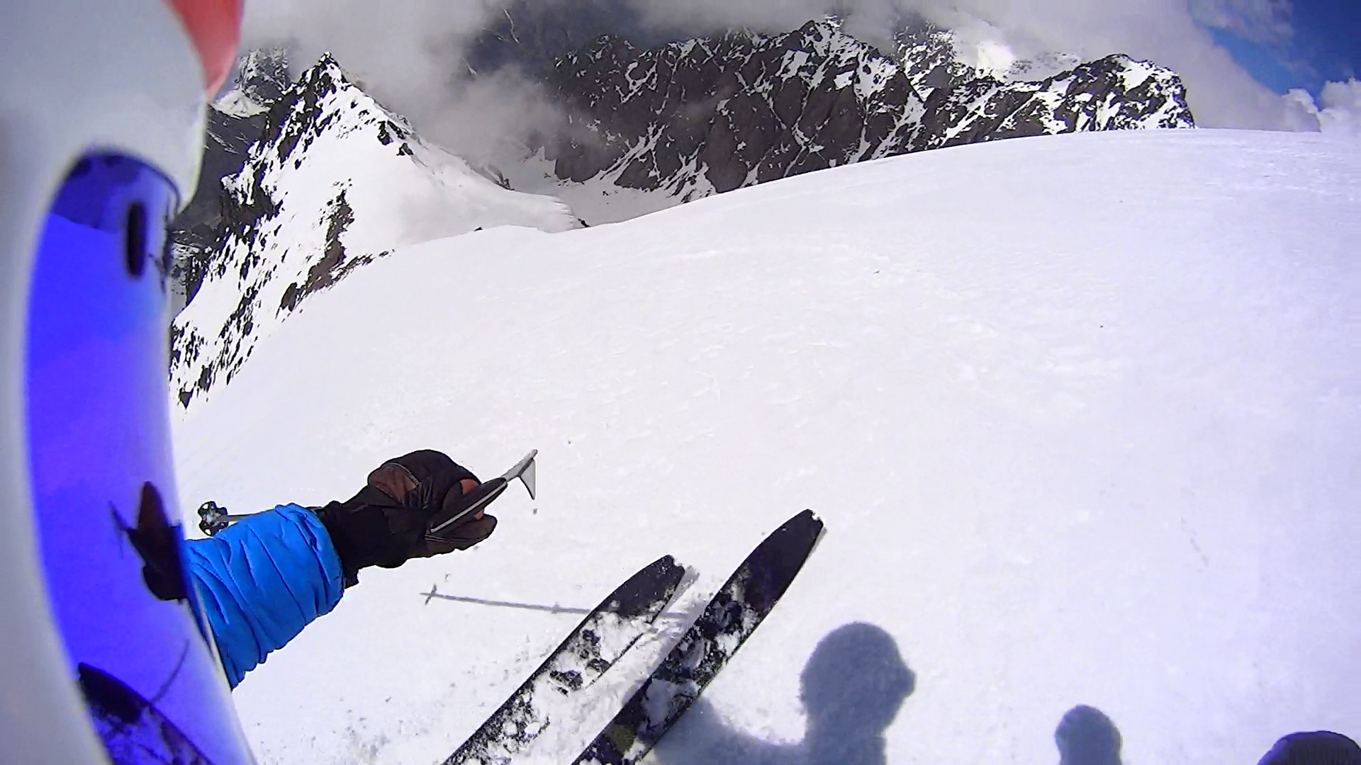 Спуск на лыжах – это уже другая история. Еще в 90-ых А. Колокольников во время хэли-ски программы на спор съехал по южным склонам на лыжах. Один без клиентов, при этом чуть не погибнув.