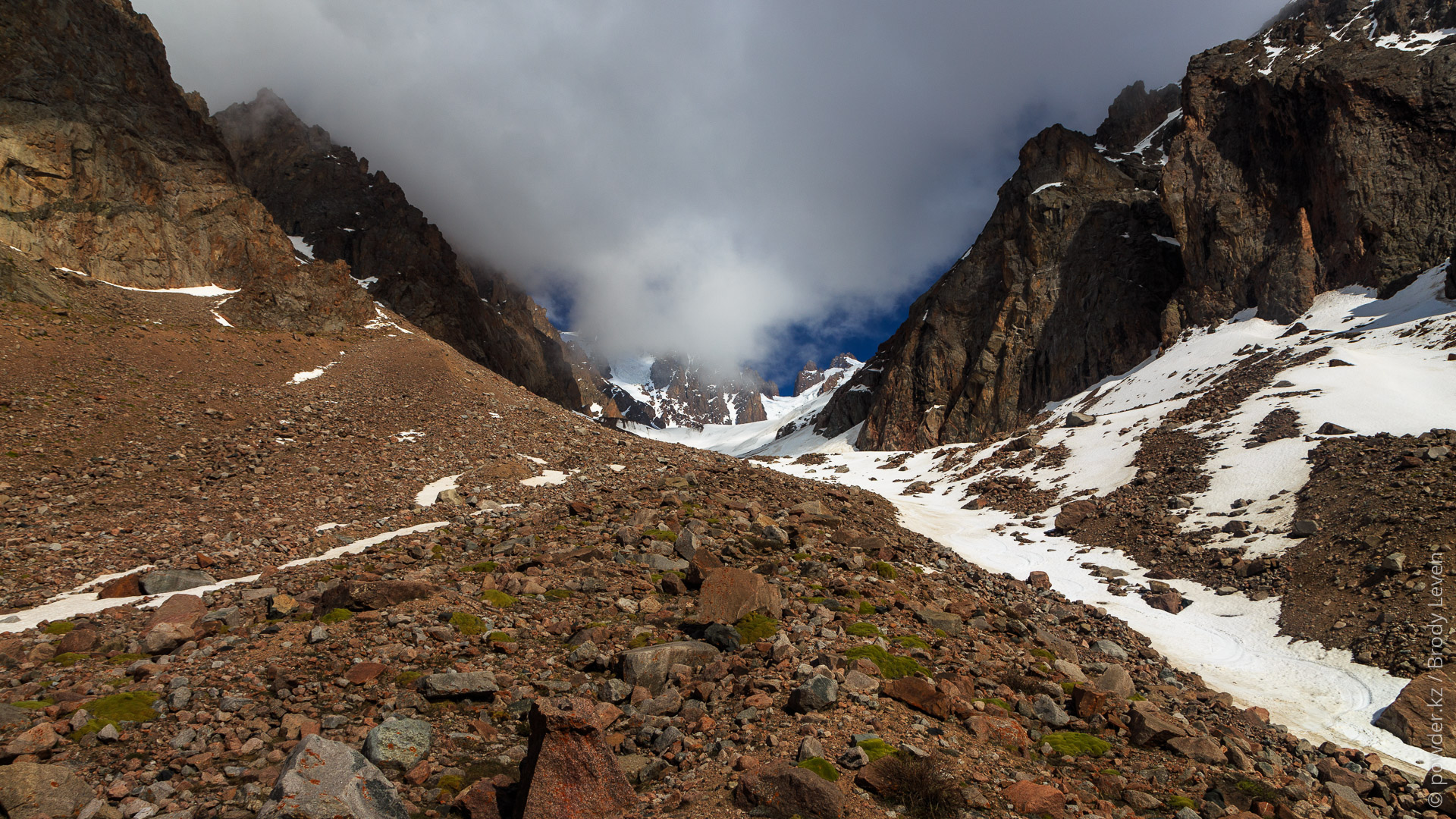 Не вижу смысла детально описывать пятикилометровый переход на «тэшку», но отмечу, что выше плотины Мынжылки 3000м, где мы продолжили подъем уже на лыжах, было невиданное мной ранее количество снега. Вначале возле ручья это не было так заметно, но дальше после поворота налево дорога просто исчезла под снегом, количество которого просто сгладило все неровности рельефа. Впервые пришлось брать немного вправо вверх, на морены «Зеленого кара», чтобы найти безопасный проход. Было не страшно, но неприятно уж точно. Все эти нюансы и пробивание тропы немного нас замедлили, но все же мы быстро дошли до финишной точки.