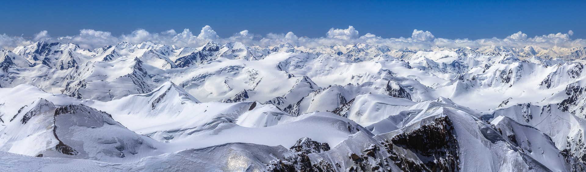 Фотографируем, обнимаемся. Был виден хребет Терскей Алатау, хребет Кунгей, горы Джунгарии. Позже на снимках я разглядел и Хан-Тенгри и даже пик Победы. Погода стояла просто аномально изумительная и получилось сделать отличные панорамы гор южнее пика Талгар. Я так хотел увидеть это все это великолепие, ведь прошлый раз, погода распорядилась совсем иначе. Был виден и город Алматы, где случайные прохожие бросившие взор на пик Талгар, даже и не подозревали какая драма разворачивается сейчас там вдали в этом ледяном царстве.