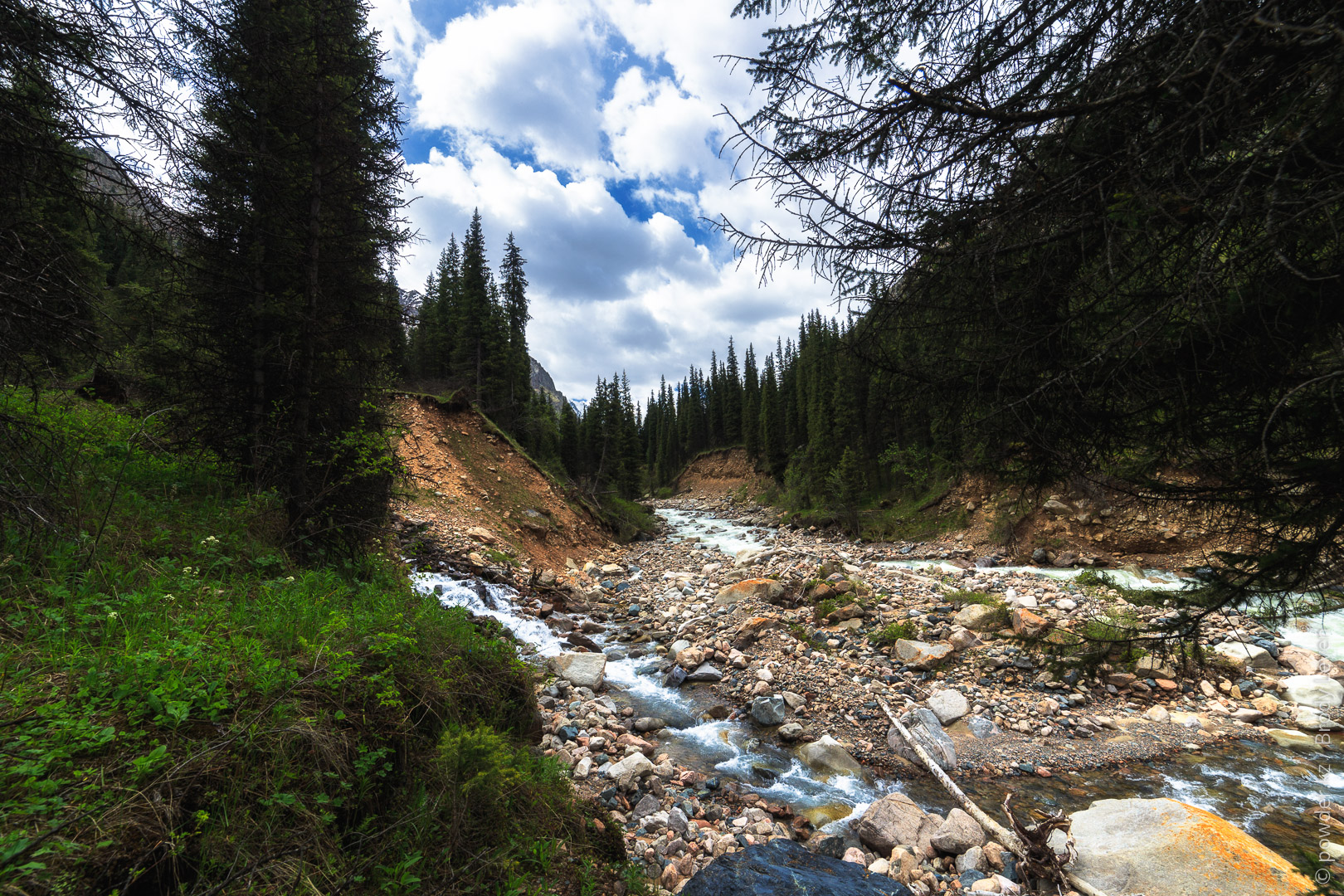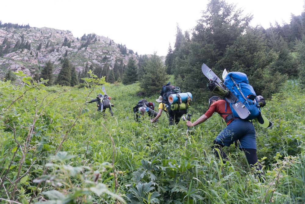 Прошло пять дней и было еще пару запасных деньков в запасе, которые нам не понадобились. Мы выдвинулись вниз ночью и в сумерках миновали призрак альплагеря, не беспокоя ни лесников, ни их возможных злобных собак. Удобная тропа, натоптанная многими поколениями альпинистов, хорошо сохранилась, и мы бодро час за часом шли по лесу, сбрасывали высоту. Постепенно ущелье сужалось, прижимы становились все круче, мы шли по высохшему руслу реки, так как ниже альплагеря прежнюю, знакомую мне тропу, размыло селем, но и эта халява быстро закончилась. Начались реальные северные джунгли, и приходилось буквально продираться сквозь заросли малины, хвои, репейника, шиповника и крапивы. В глазах друзей читалось уныние и силы команды постепенно таяли от такой напряженной работы. Спрей работал, клещей не было, но от этого было не слаще. Да, идти вниз было легче чем вверх, но рюкзаки постоянно задевали какие-то ветки, плечи дергало, одежда и обувь порвалась до дыр.