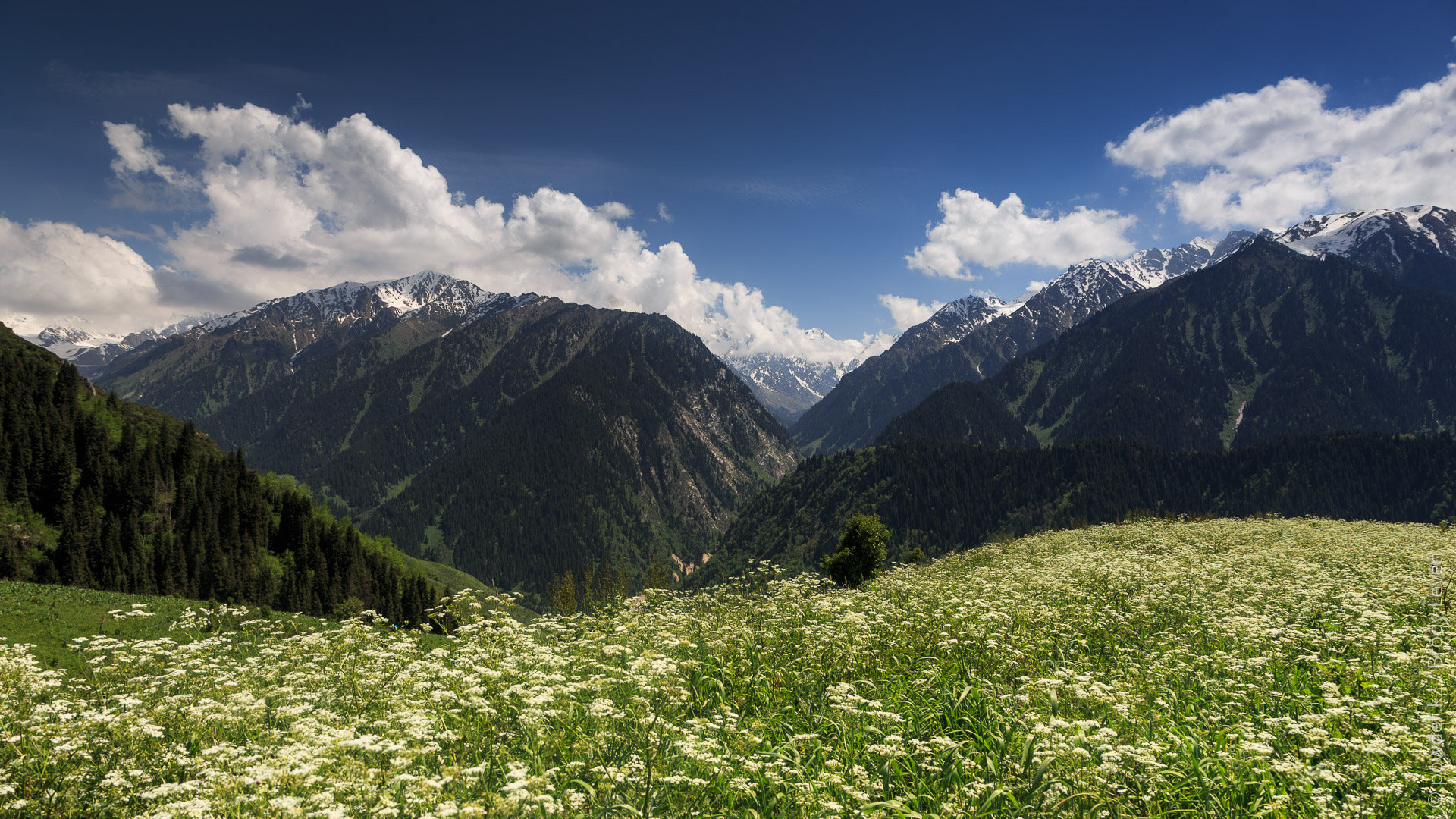 Собственно, дальше мы прошли мимо домика лесника и немного по дороге вниз, пока Костя не заприметил тропу, уходящую вправо наверх на холмы, и офлайн-карты, загруженные в телефон, не врали. Мы по травянистым склонам и тропам выгребли наверх на гребень. Это были неизвестные многим Малые Горы Талгара. Кстати, подъем был очень живописный – ели, ручьи из которых удалось вдоволь напиться и умыться, на верху огромные поляны белых как простыня цветов.