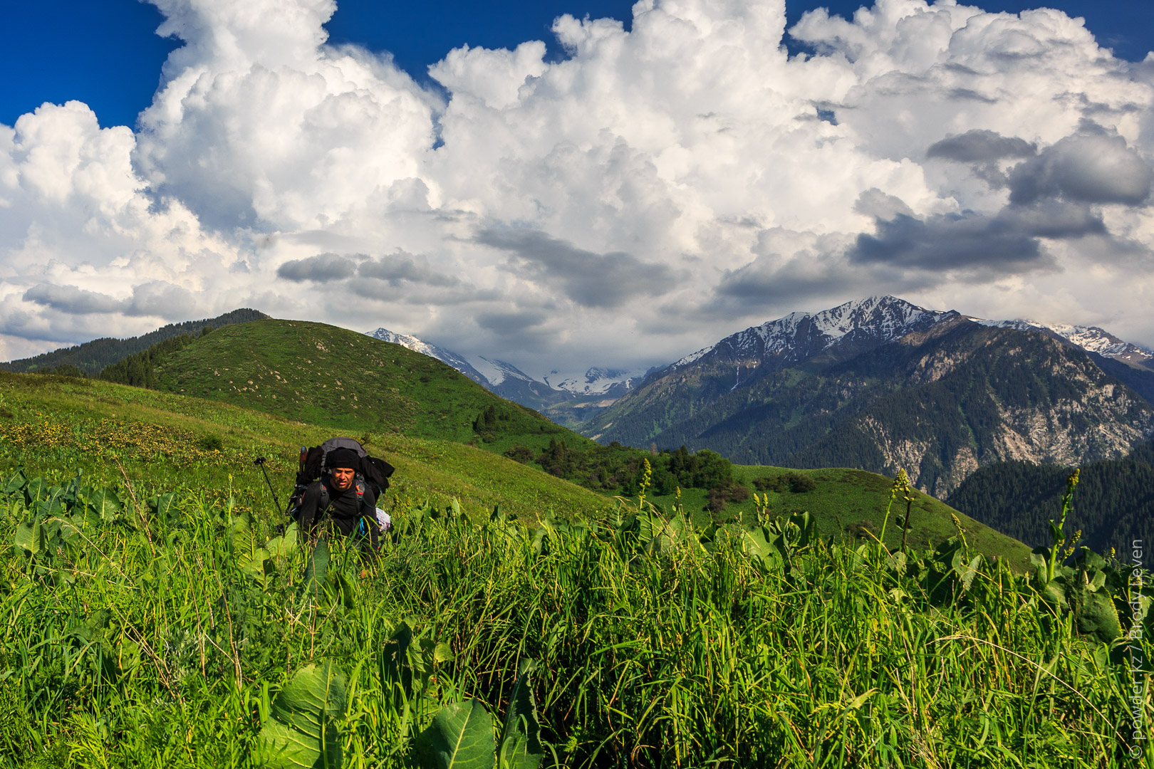 Местность сильно напоминала наше популярное Кок-Жайляу, но в разы чище, более дикое, более живописное, и никаких тебе людей. Выйдя наверх мы набрали 400м, но нам еще предстояло сбросить оставшиеся финальные 700м до машины. Такие переходы были парням в новинку и чувствовалось, что все… – сил больше нет. На спуске приходилось проходить метров сто-триста и ждать, проходить и ждать. Конечно я тоже устал, но благодаря тренировкам, все-таки запас сил еще немного, но оставался. Мы всей командой взяли волю в кулак и через различные еловые, урюковые и березовые рощи по тропам и дорогам спустились к Аниной машине, которая ждала нас выше какой-то Талгарской фермы. Итого 17км за день и больше 14 часов перехода.