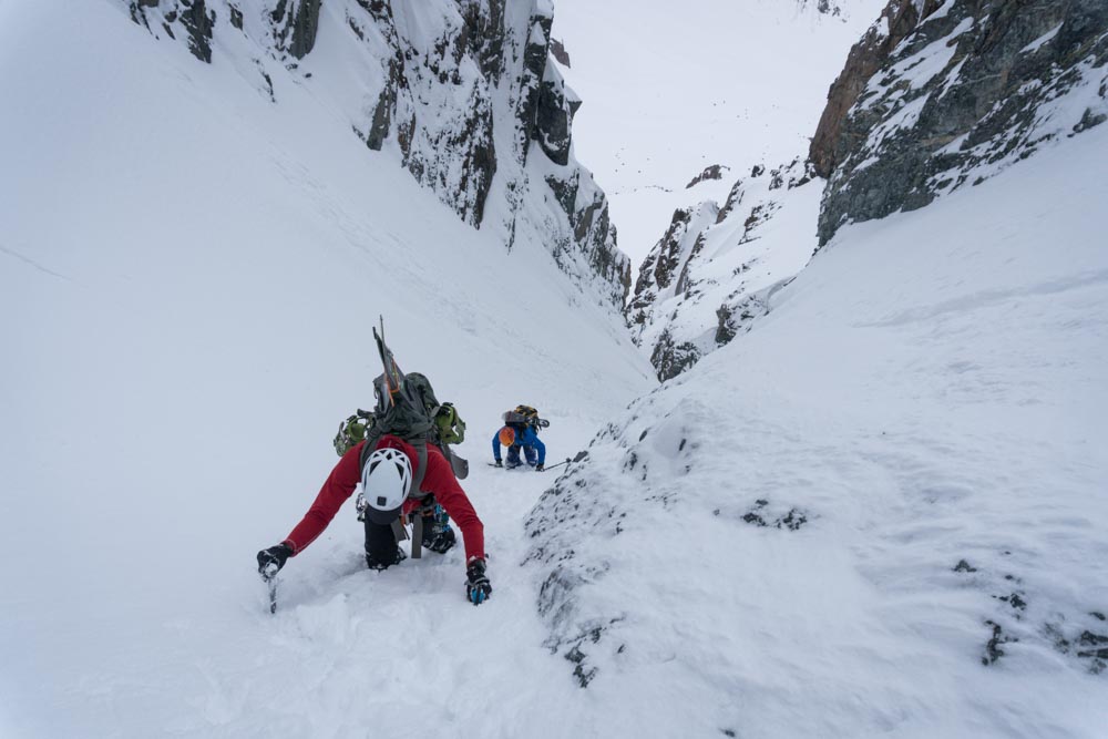 Мы моментально решили нырнуть в ближайший кулуар от так называемых «Заячьих ушей», характерного жандарма на гребне.