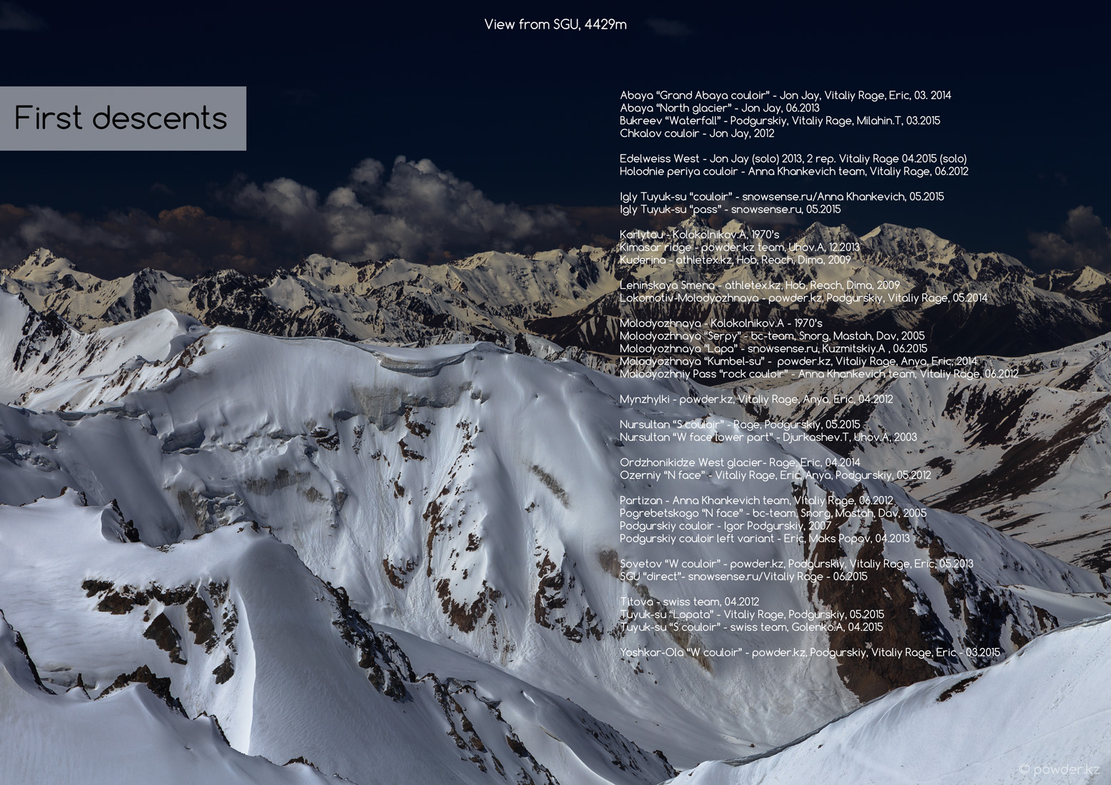 Описаны все основные районы, и в дальнейшем, будут добавляться все новые маршруты и линии. Работа полностью состоит из моих фотографий, и впервые, среди всех гор бывшего СССР, именно наш район описан наиболее информативно, добавлены категории трудности, учтены мелкие нюансы. Все это представлено в легкой, красивой и доступной форме на сайте, и наряду с «картой маршрутов» powder.kz, наш проект — в своем роде единственный, на фоне многих коммерческих ресурсов с гидами.