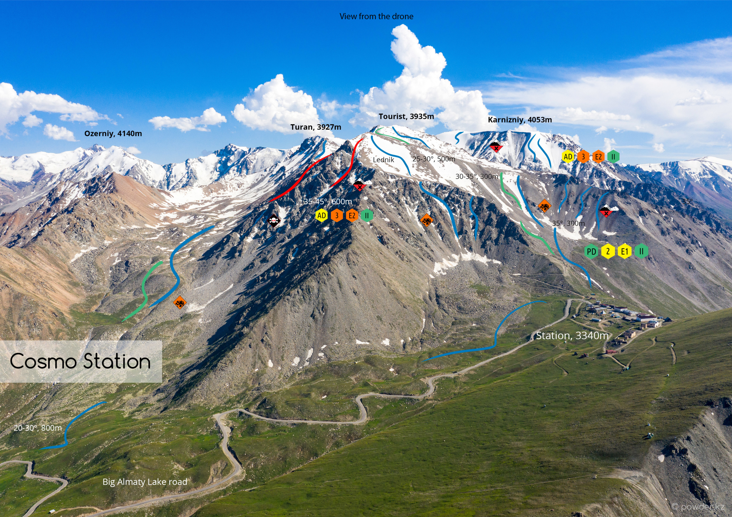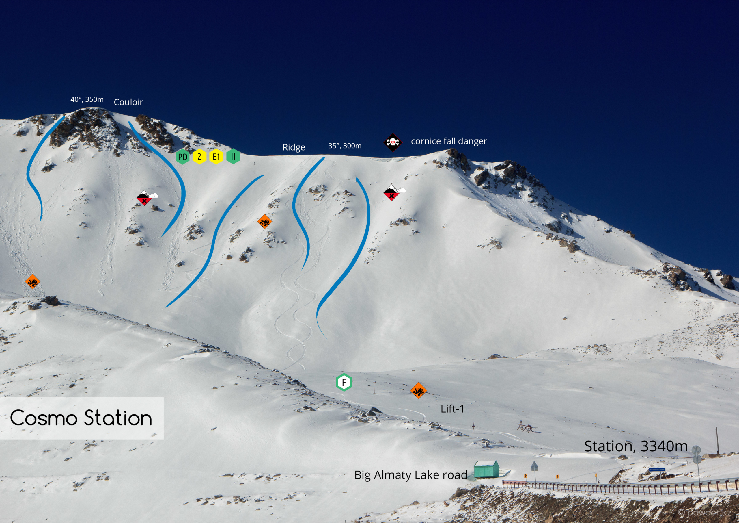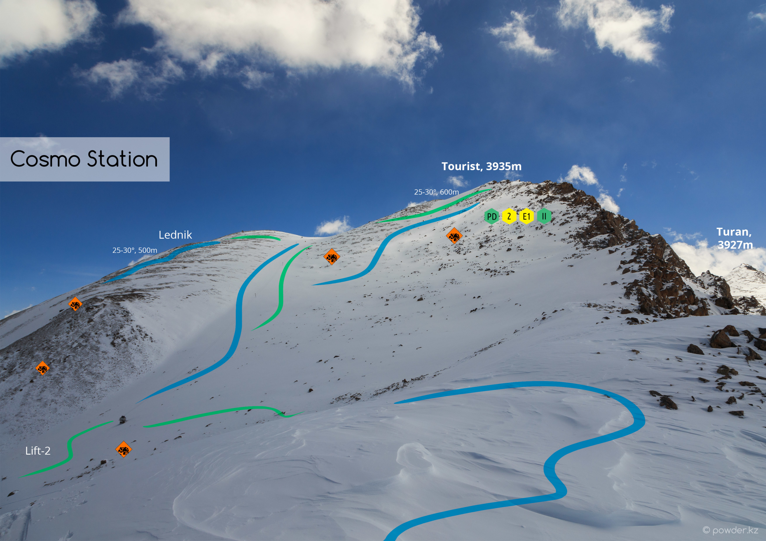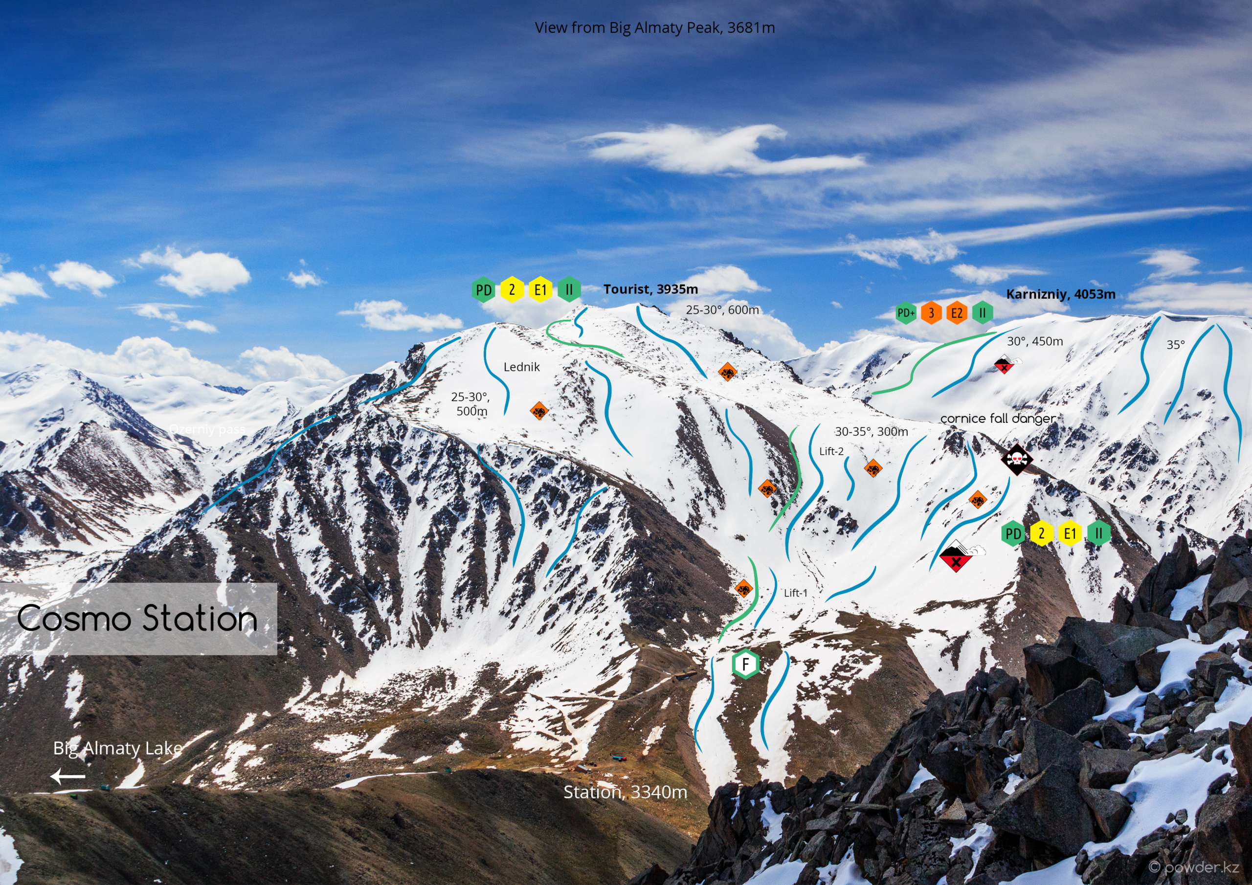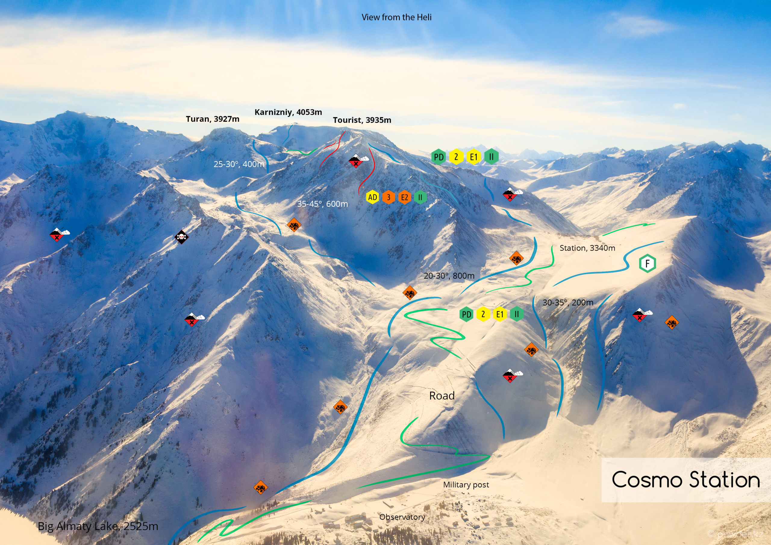 02.03.2020 – Cosmo Station. Added 2 new N-E lines from Tourist Peak (First descent by me in 2017 & 2018. Second descent by “Bon Appetit Ski” in 2019). Added new lines by “Ride The Planet” on Karnizniy peak.