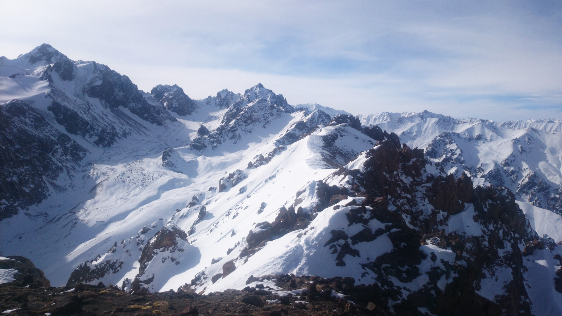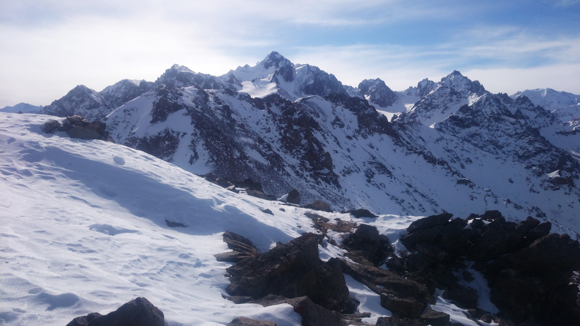 Заряженный после субботы, я решил осуществить новый план. Подъем от Чимбулака, затем траверс Чимбулачки, проход по гребню через пики Башута и Панораму, и далее выход на Кимасаровский гребень, где выбора линий предостаточно, несмотря на кучу следов. Свежего снега не было больше месяца.