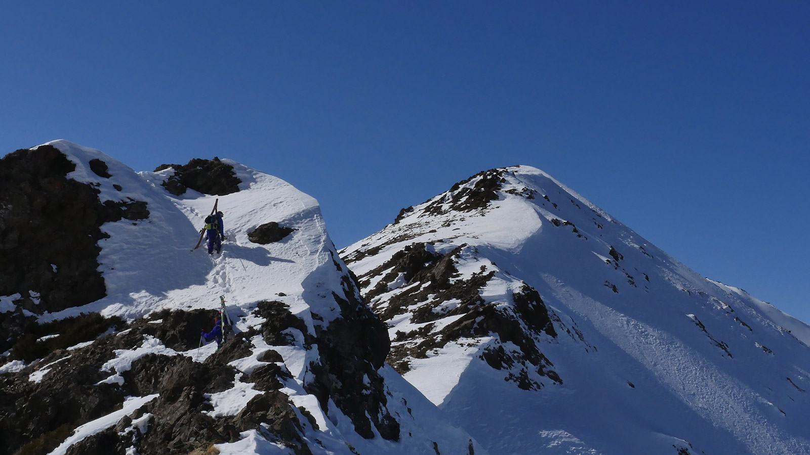 Красивый гребень. Мне на Конус помеченный флагом. Шел в фрирайд-скитур ботинках, не самых легких но и не самых тяжелых. Итого 3 часа включая отдых и финальную тропежку, перед “конусом” много свежего снега. Клей на скинах течет и я не стал их одевать. Взял чтобы не нарушать первое правило фрирайдера – “всегда бери скины”, мало ли, в случае чего выгребать. Думаю, в кроссовках и с Динафитом было бы вяко быстрее, но взял Армаду – на них кайфовее.