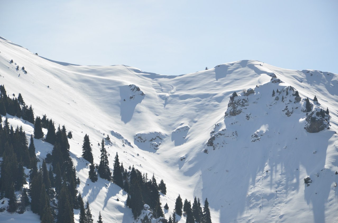 У кого что, а у нас rock’and’roll . Просто отлично сходили и катнули кулуар “Медео”. Для меня это был долгожданный проезд, в прямом смысле этого слова . В прошлом году была попытка спуска, но из-за лавиной опасности, пришлось спуститься по другому склону. Основная сложность этого проезда – уловить подходящий снег. На всем склоне он разный, но основное накопление снега наверху и его действительно много. Место достаточно стремное, как и в принципе, все наши кулуары в зоне леса. Поэтому совет желающим катнуть в этом месте – без знаний, уровня и снаряжения, даже не думать туда соваться .