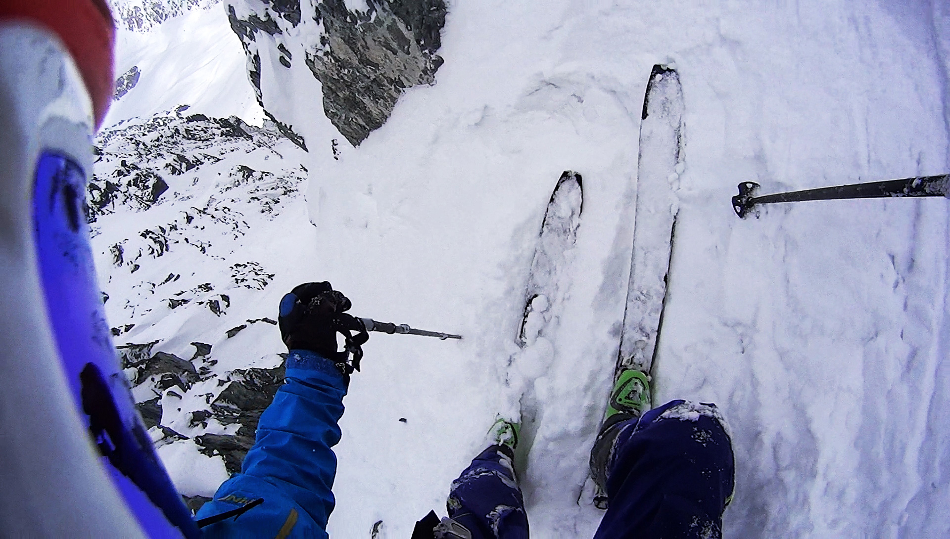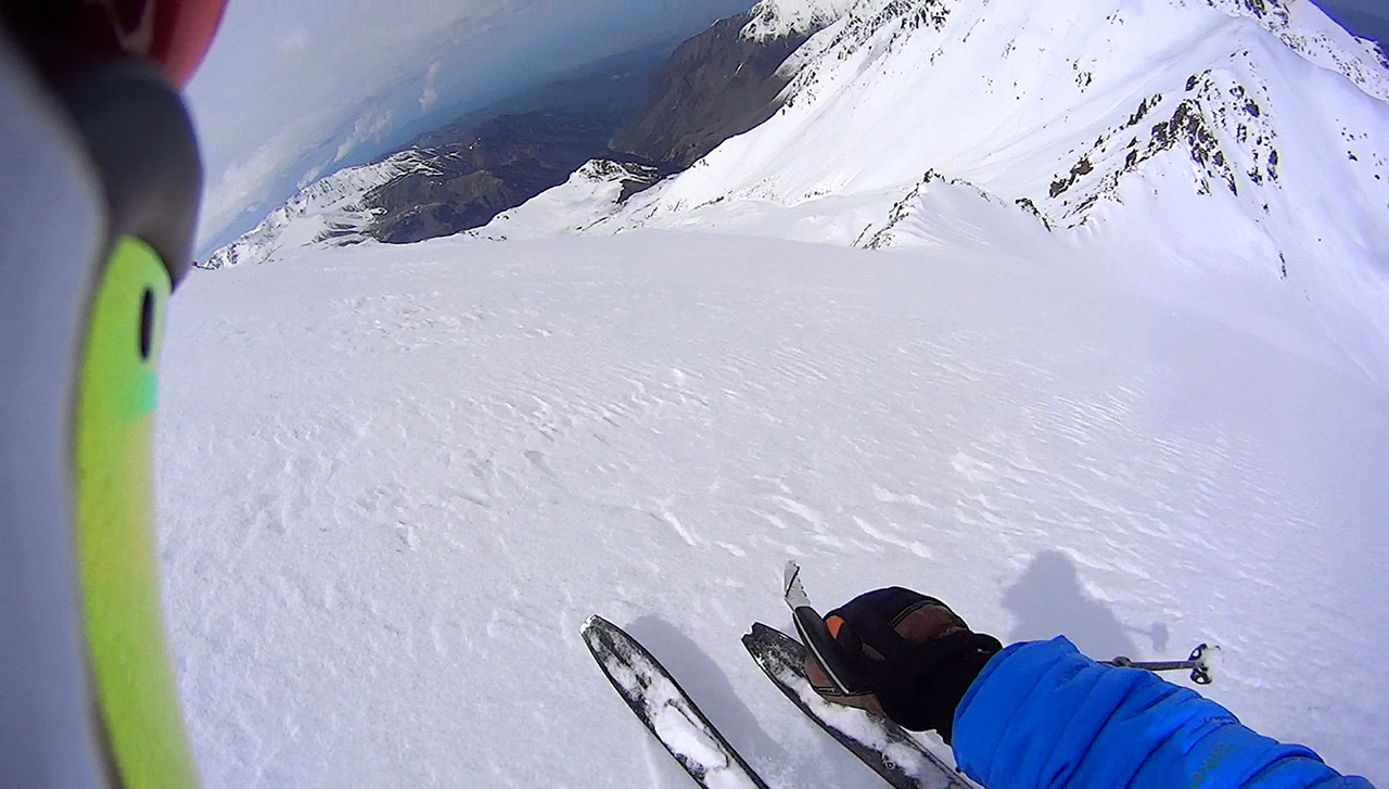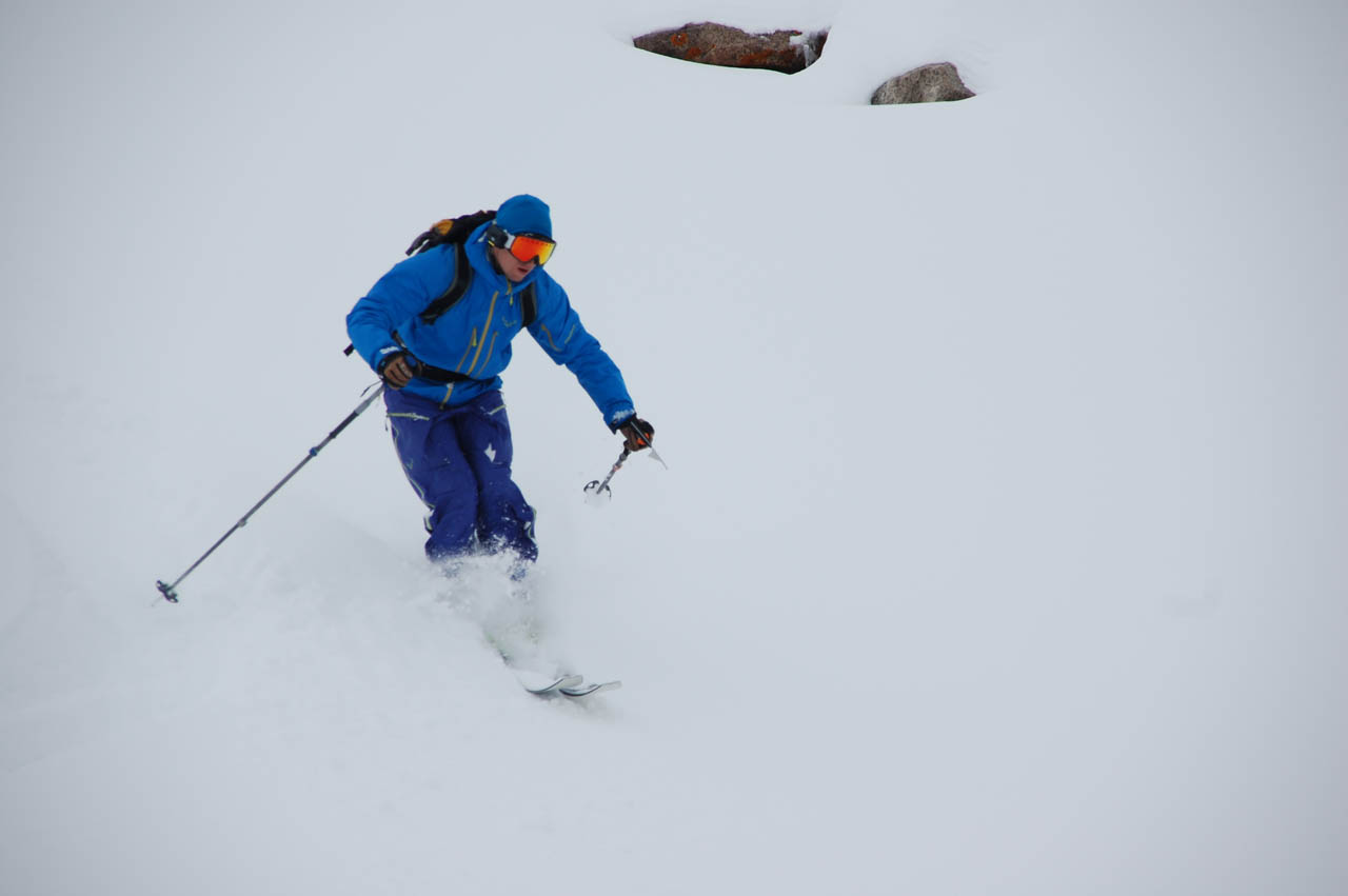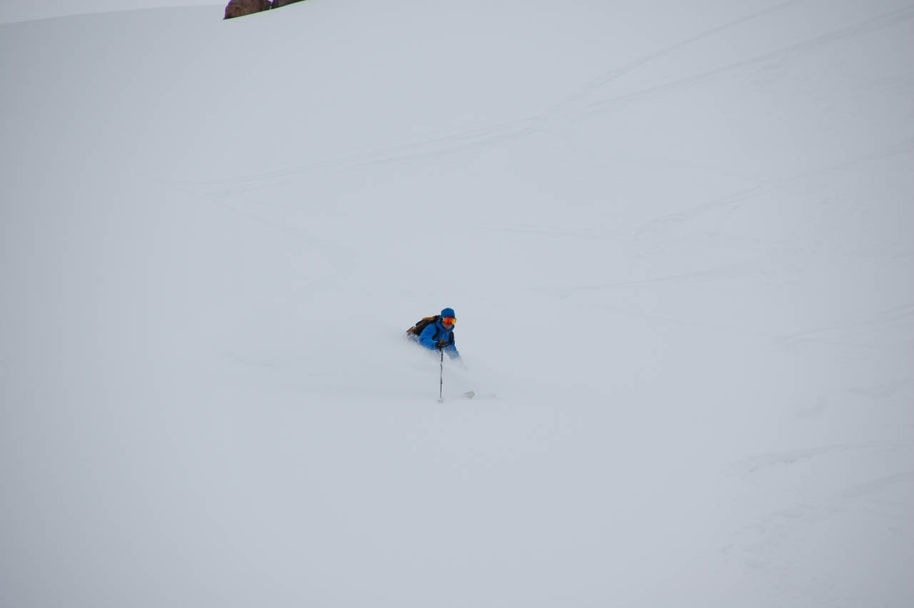 Виды потрясающие. Сколько раз я тут был? Спуск естественно по пути подъема.  Стартую как обычно первый, снег просто волшебный, останавливаюсь (к сожалению) надо сфотографировать остальных. Прямо искусство найти такое хорошее безопасное место в хаосе лавин и отрывов. На перевале 2 падения, ребятам еще подтягивать технику, жаль, что на более сложное с таким раскладом не сунешься.