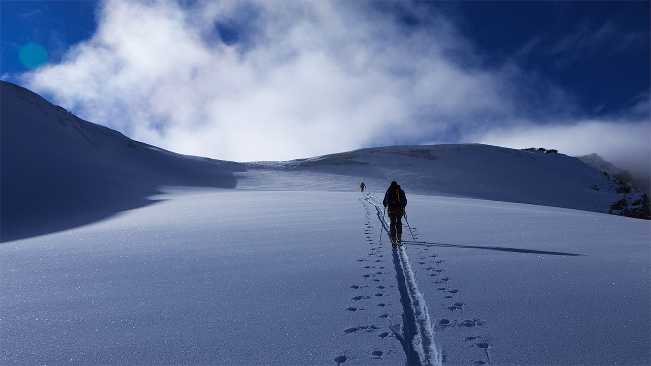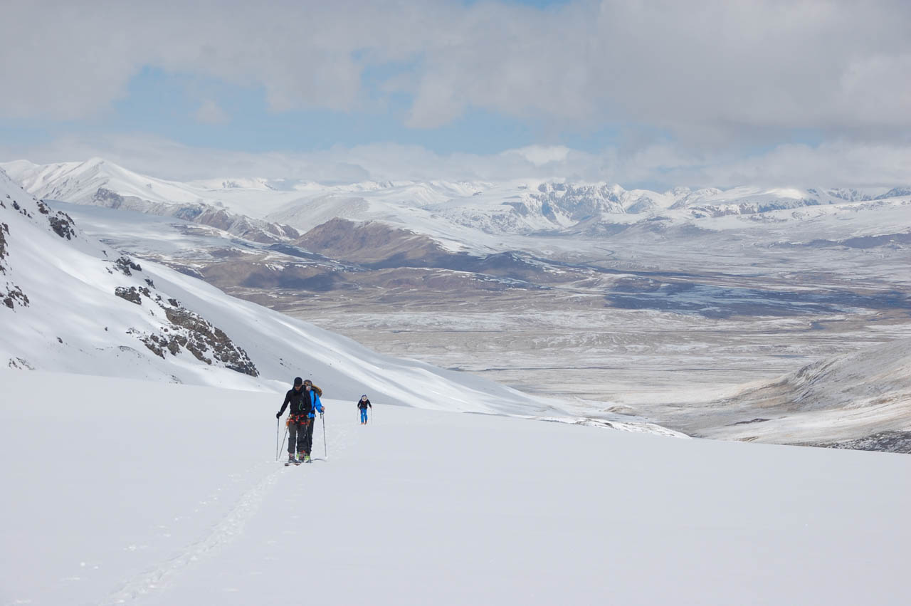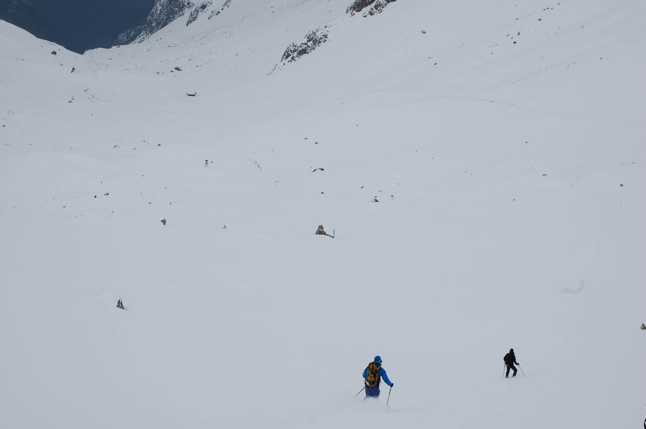 Наконец-то нормальная погода. Холодно и свежо. Снег немного улегся морозный и искрящийся. Плечо полностью сошло. Такой знатный отрыв я не видел никогда. Где кататься? Дошли до «трактора» (полностью засыпанного).  Пока шел, много думал про коммерческий фрирайд и альпинизм. Про Лаврова, Гену. Разные мысли… Обвязки, буры, биперы. Дополнительные предосторожности не помешают. Теперь тропить мне. Быстро двигаюсь в сторону перевала. Трещины все засыпаны. Лавинные выносы огромные, кое-где отвалились сераки. Спешился на самой крутой части, 15 метров вверх. Перевал еще не сходил, слоев много. Так мне кажется эффективнее и безопаснее. На перевале Туюк-су холодновато и ветрено. Еще немного и вся команда на Плече. Так ходить все равно получается быстрее, чем лезть в лоб, но все зависит от количества снега и трещин.