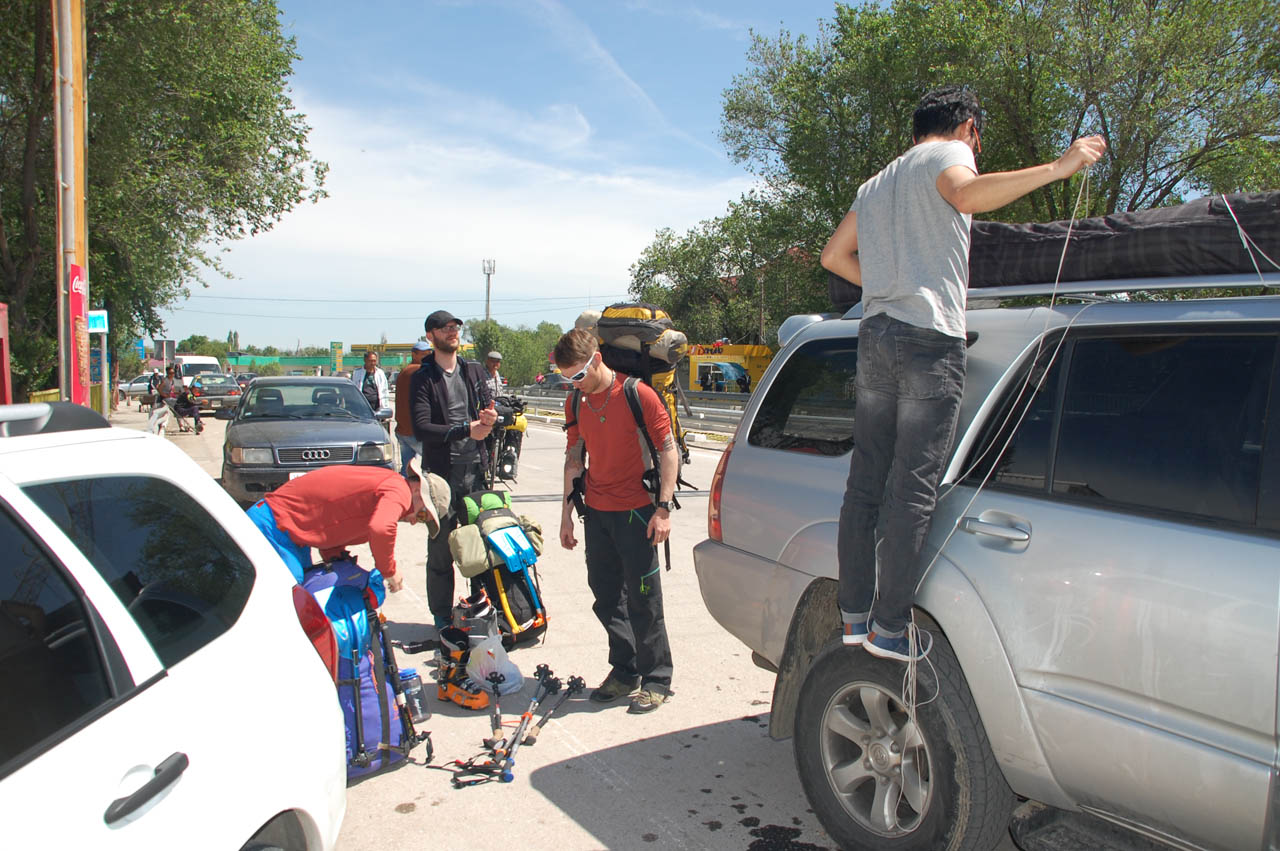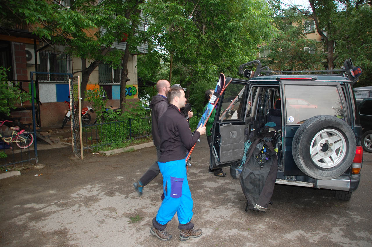 Утро. Закупился орехами, мюсли и шоколадом. В 9:00 сборы. Нам наверх. Игорь помог до Медео, а дальше за 5400тг. уже на такси до конца асфальта. Эко-такси вместило нас четверых с рюкзаками и лыжами без проблем.