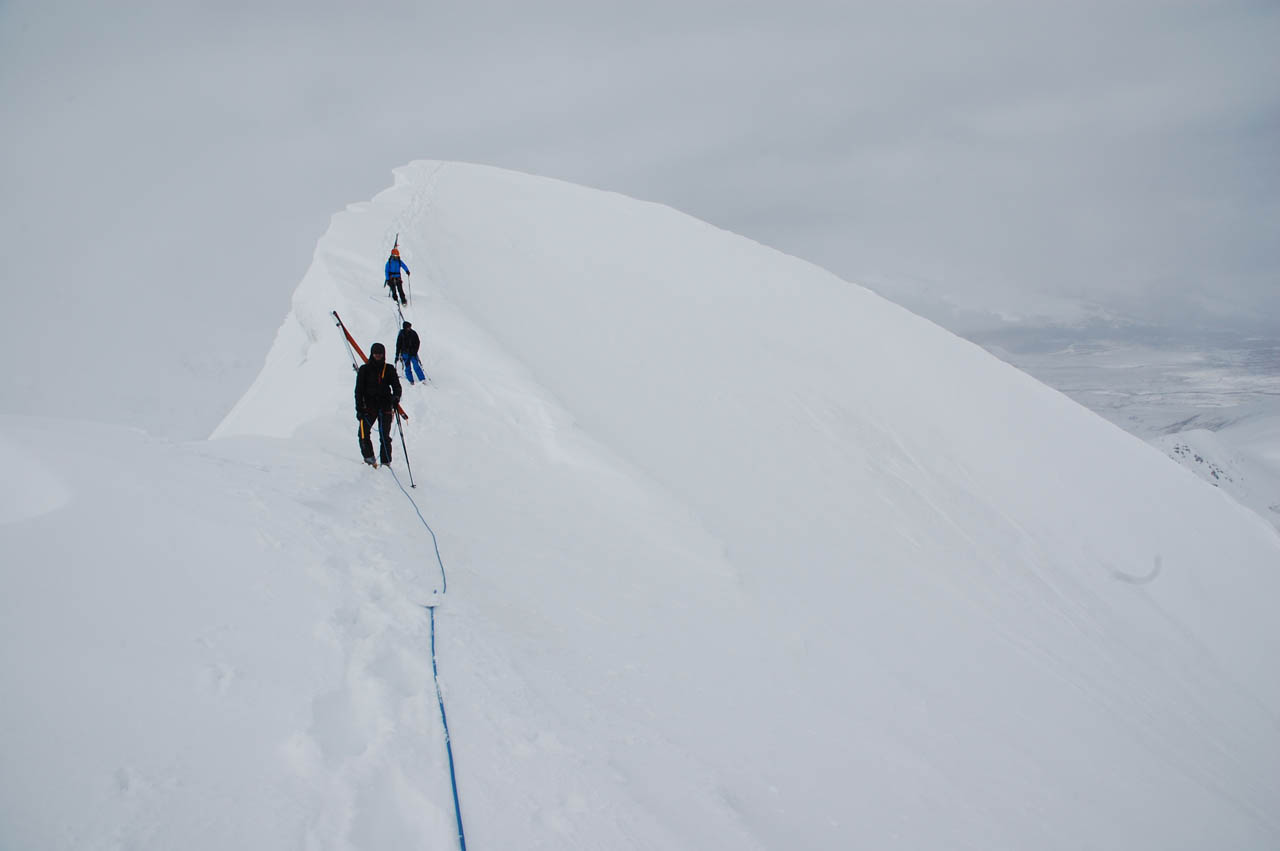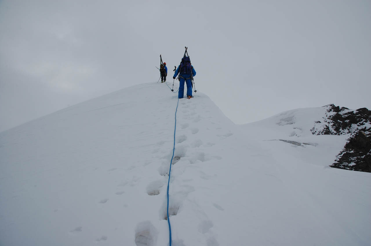 Конечно мокрый снег и черные тучки так и манили повернуть, но все-таки я справился с нахлынувшими сомнениями, и благодаря видению Игоря мы удачно пролезли классический маршрут. На первой веревке для скорости замутили перила, а дальше в связке каждый со своими лыжами и в ски-турных ботинках.