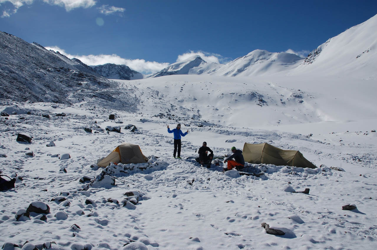 Немного нервничаю из-за спешки, да и снег в диковинку. Начал тропить, идется легко. Переходы по одному, мало ли что. Друзья с Европы не знакомы с нашими реалиями, снег там другой. Вышли на гребень, выше уже надувы. Идти не хочу, стартуем здесь. Пока одевал лыжи, сильно надавил на крепление, и она съехала. Небольшая боль в связке, но вроде все нормально. Снег очень мягкий, пухляк, съехал до дороги. Наблюдаю. Рик падает. Барту и Стэну непривычно. Дальше естественно по морене до Мынжылков, ведь по дроге опасно. Стартую, задавил лыжи слишком вперед, падаю. Видимости почти никакой, все на балансе. Ниже уже получше. Моя группа ориентируется по моим следам.  Видимости прибавилось – стало веселее. Поравнялись с Лехой и Юрой, ему на Мынжилки, а всем остальным обратно по пути подъема на базу. Снег уже тяжелый, выше опять лучше. Тропили с Лехой по очереди. Идется нормально, без лыж было бы совсем печально. Снегоступы – боль. Снег все валит, его больше и больше. Пришли обратно и опять в сон на пару часов. Выжали из этого дня все что могли. Опасно почти везде, 4 или 5 балов по лавинной шкале. Кое-где сошло до льда. Разъяснилось только к ночи и то не совсем. Чай, спать. Завтра Плечо Туюксу.