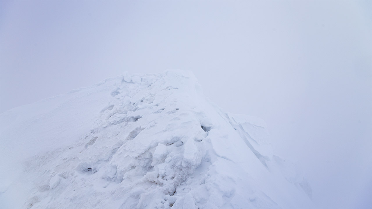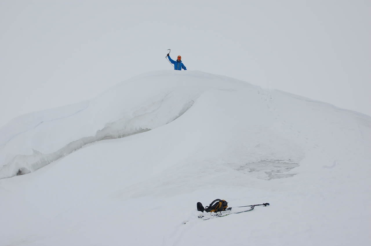 Непогода следующего дня предвещала тёплую ночь, а значит соответствующий снег. Подъем не ранний и на пик поднялись достаточно быстро)) На вершине один единственный раскат грома намекнул: «П*здуйте-ка ребята, быстренько вниз». Успели спуститься до надвигающегося снегопада. Очень хорошо ))