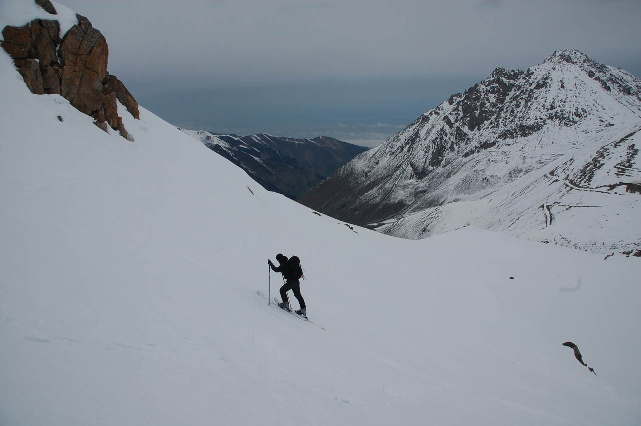 Напарник в стиле ски-альпинизма обработал этот участок и скрылся за перегибом. Места для маневра было совсем мало, и я, придерживаясь за ледоруб спустился по крутому участку лесенкой. Кондиция снега была такая, что даже на таком уклоне около 40-45 градусов лететь бы пришлось до самого низа. Сорвать кант было нельзя!