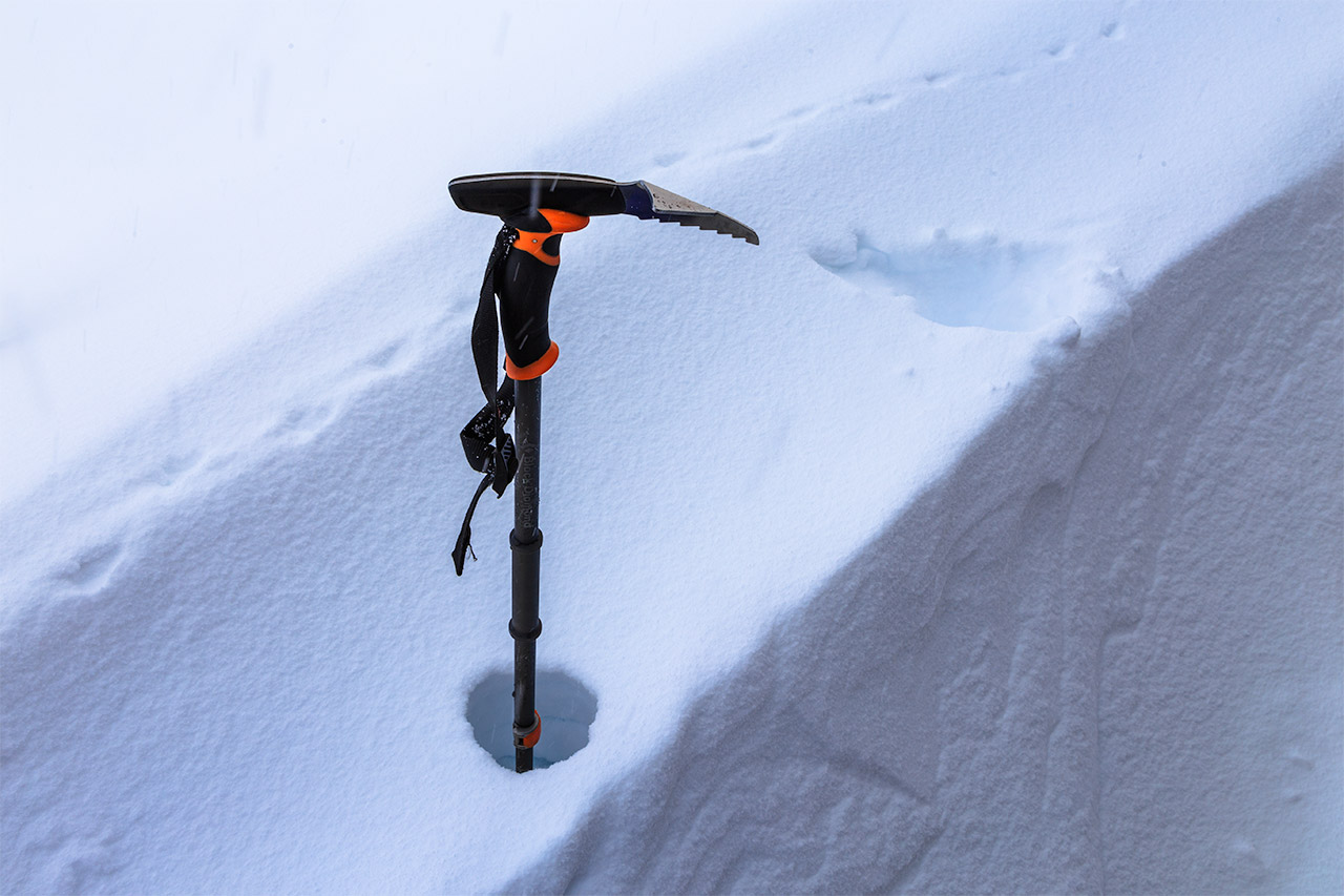 По снаряжению на каждого: бипер, щуп, лопата, обвязка, каска, кошки, ледобур с оттяжкой, корделет с карабином. Взяли тонкую двадцатиметровую веревку. Я со своим любимым ледорубом Petzl, а Рэйдж с Black Diamond Whippet.