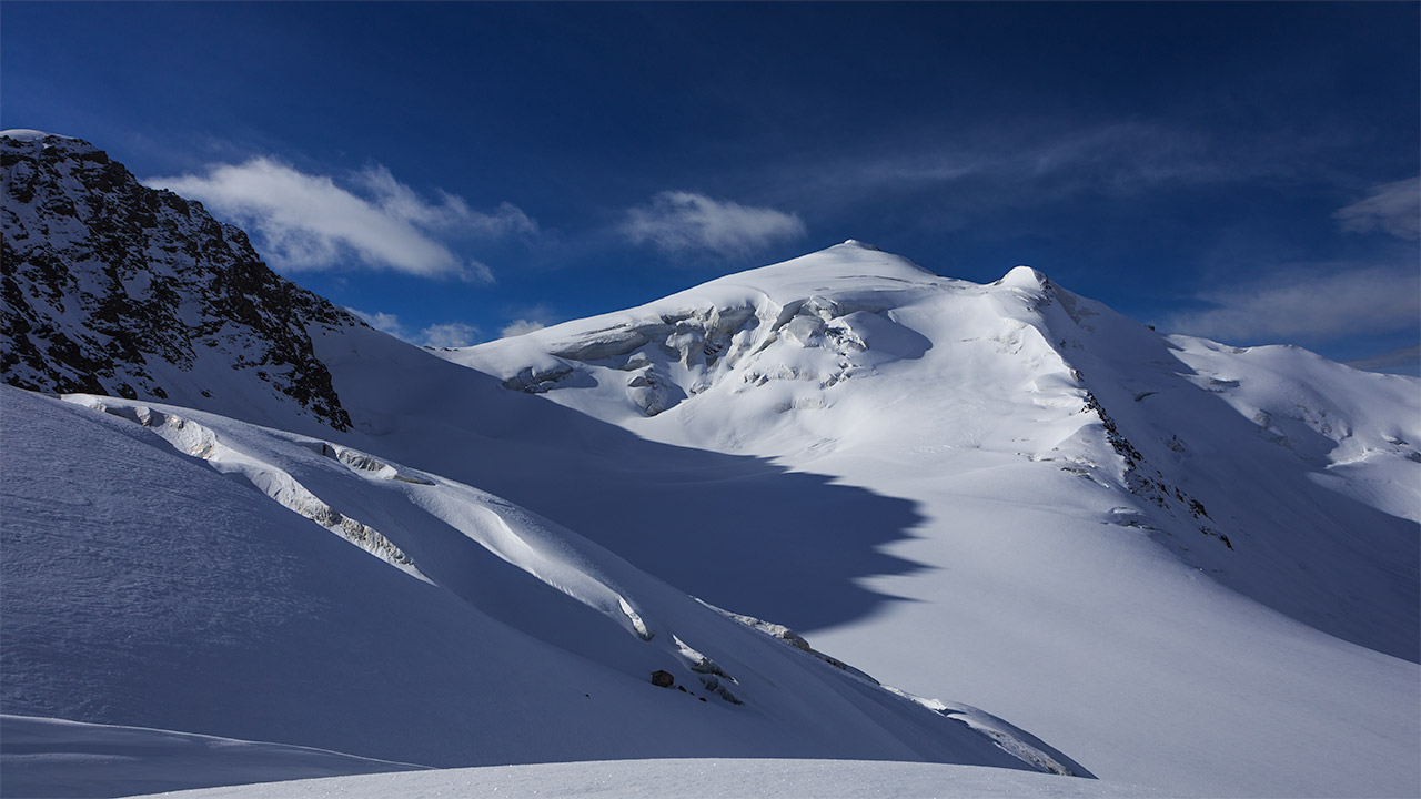 Рик как всегда бодрячком, сказывается большой опыт в Альпах, в том числе и Haute Route. Дальше уже проще, но в удовольствие. На удивление вышел идеальный денек. Отдохнули, небольшая фотосессия. Снег уже раскис и превратился в кашу. Кое-где то и гремит, съезжают точечные лавинки.