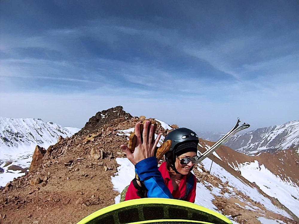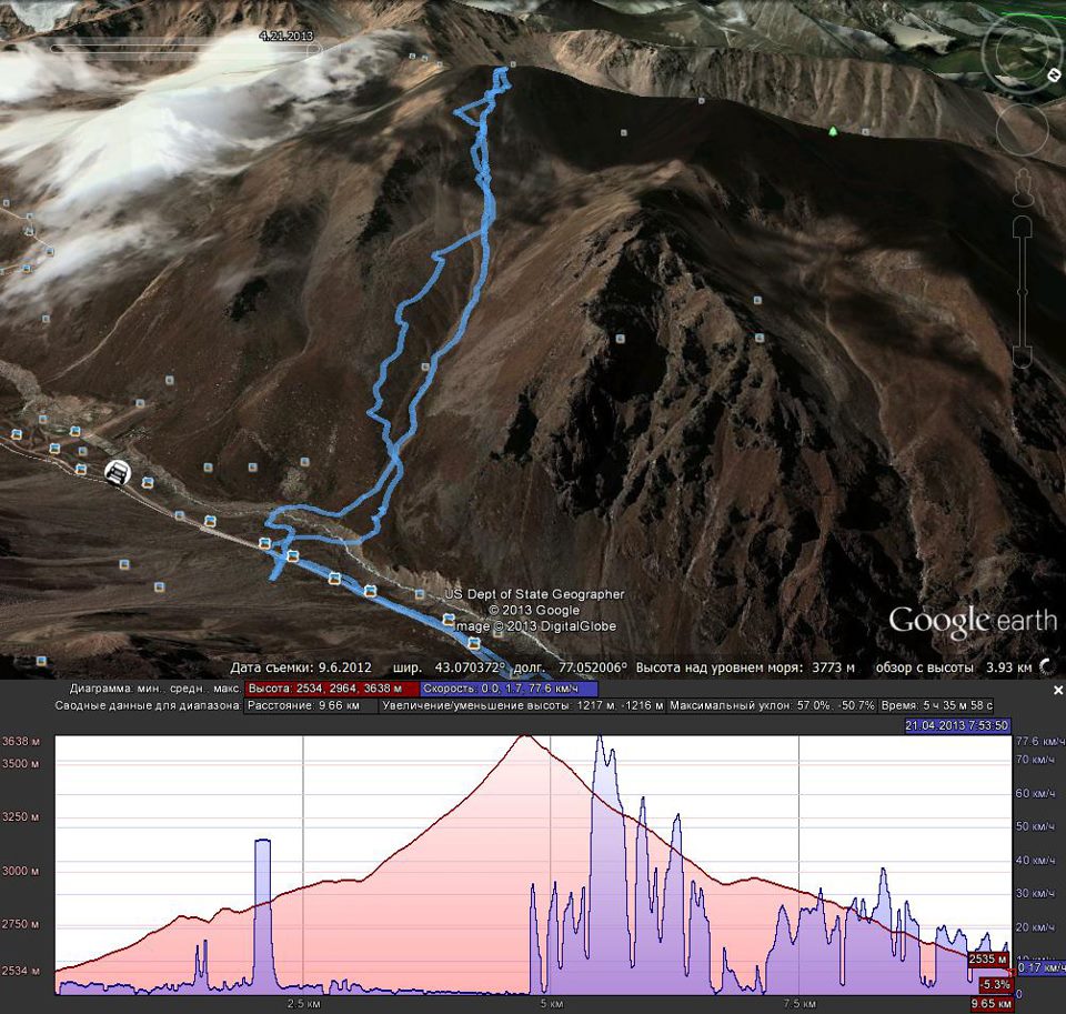 В то время, как наши друзья отправились на первопроезд кулуара Абая, мы с моей подругой Юлей Крыловой выбрали для женского беккантри относительно несложный, как нам тогда казалось, маршрут на пик Памяти. Этот спуск мы открыли еще в позапрошлом году. Забегая вперед скажу, что в этом году он представляет из себя нечто совершенно другое – снега в несколько раз меньше по сравнению с прошлым годом. Очень надеемся, что в апреле будет много осадков в горах, иначе сезон высокогорного катания закроется раньше обычного: